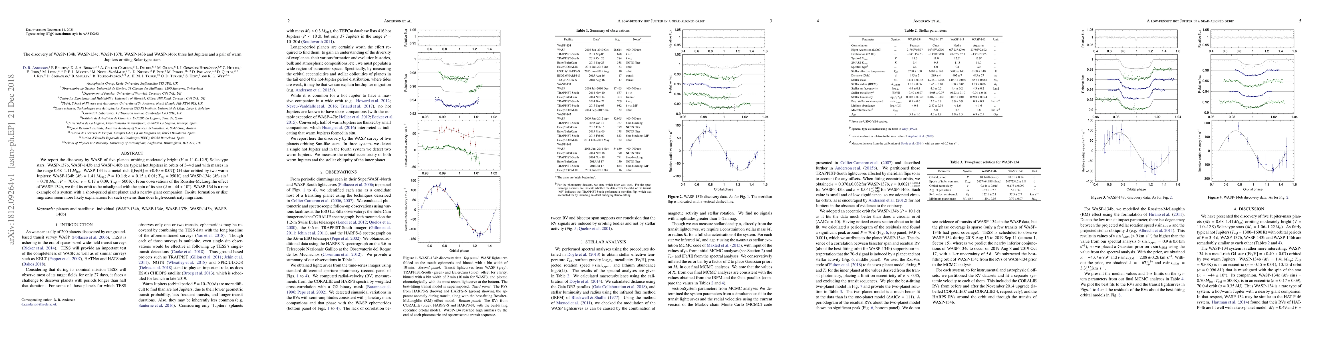 The WASP project discovered five planets, including three hot Jupiters and two warm Jupiters orbiting Solar-type stars. Notably, WASP-134b and WASP-134c are warm Jupiters with misaligned orbits relative to their star, suggesting complex formation scenarios.