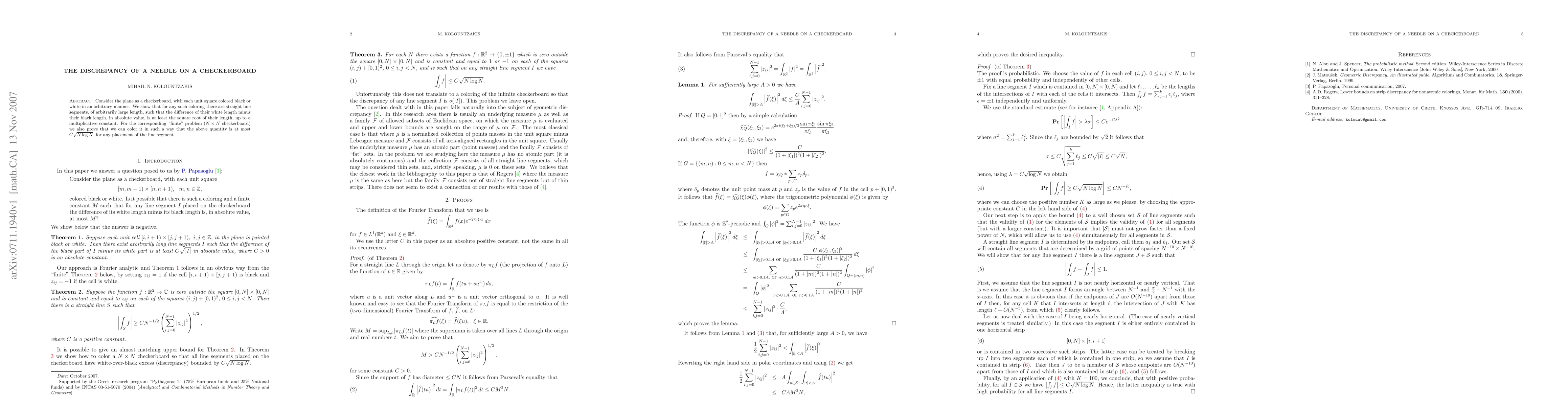 Consider the plane as a checkerboard, with each unit square colored black or white in an arbitrary manner. We show that for any such coloring there are straight line segments, of arbitrarily large length, such that the difference of their white length minus their black length, in absolute value, is at least the square root of their length, up to a multiplicative constant. For the corresponding ``finite'' problem ($N \times N$ checkerboard) we also prove that we can color it in such a way that the above quantity is at most $C \sqrt{N \log N}$, for any placement of the line segment.
