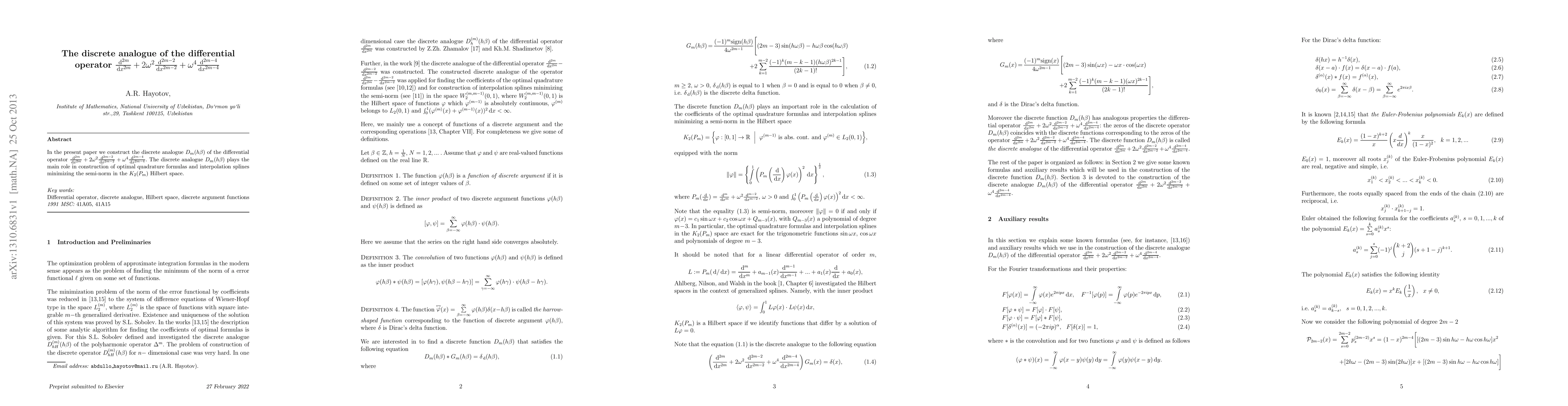 In the present paper we construct the discrete analogue $D_m(h\beta)$ of the differential operator $\frac{d^{2m}}{d x^{2m}} + 2\omega^2\frac{d^{2m-2}}{d x^{2m-2}} + \omega^4\frac{d^{2m-4}}{d x^{2m-4}}$. The discrete analogue $D_m(h\beta)$ plays the main role in construction of optimal quadrature formulas and interpolation splines minimizing the semi-norm in the $K_2(P_m)$ Hilbert space.