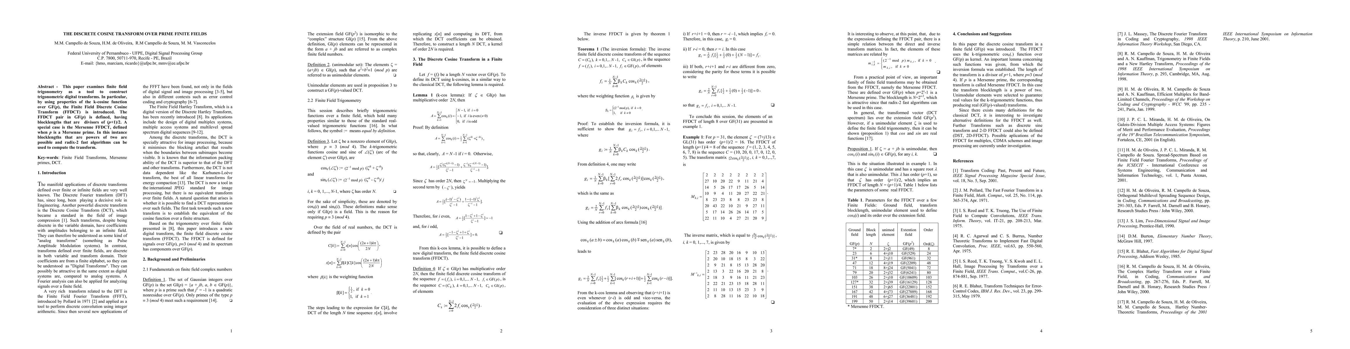 This paper examines finite field trigonometry as a tool to construct trigonometric digital transforms. In particular, by using properties of the k-cosine function over GF(p), the Finite Field Discrete Cosine Transform (FFDCT) is introduced. The FFDCT pair in GF(p) is defined, having blocklengths that are divisors of (p+1)/2. A special case is the Mersenne FFDCT, defined when p is a Mersenne prime. In this instance blocklengths that are powers of two are possible and radix-2 fast algorithms can be used to compute the transform.