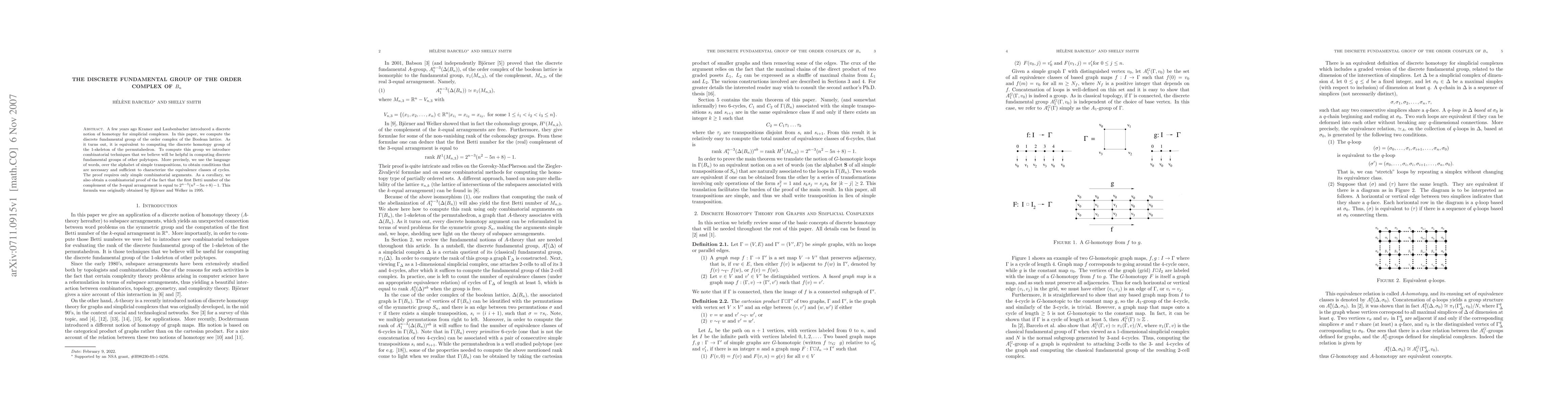 A few years ago Kramer and Laubenbacher introduced a discrete notion of homotopy for simplicial complexes. In this paper, we compute the discrete fundamental group of the order complex of the Boolean lattice. As it turns out, it is equivalent to computing the discrete homotopy group of the 1-skeleton of the permutahedron. To compute this group we introduce combinatorial techniques that we believe will be helpful in computing discrete fundamental groups of other polytopes. More precisely, we use the language of words, over the alphabet of simple transpositions, to obtain conditions that are necessary and sufficient to characterize the equivalence classes of cycles. The proof requires only simple combinatorial arguments. As a corollary, we also obtain a combinatorial proof of the fact that the first Betti number of the complement of the 3-equal arrangement is equal to $2^{n-3}(n^2-5n+8)-1.$ This formula was originally obtained by Bj\"orner and Welker in 1995.