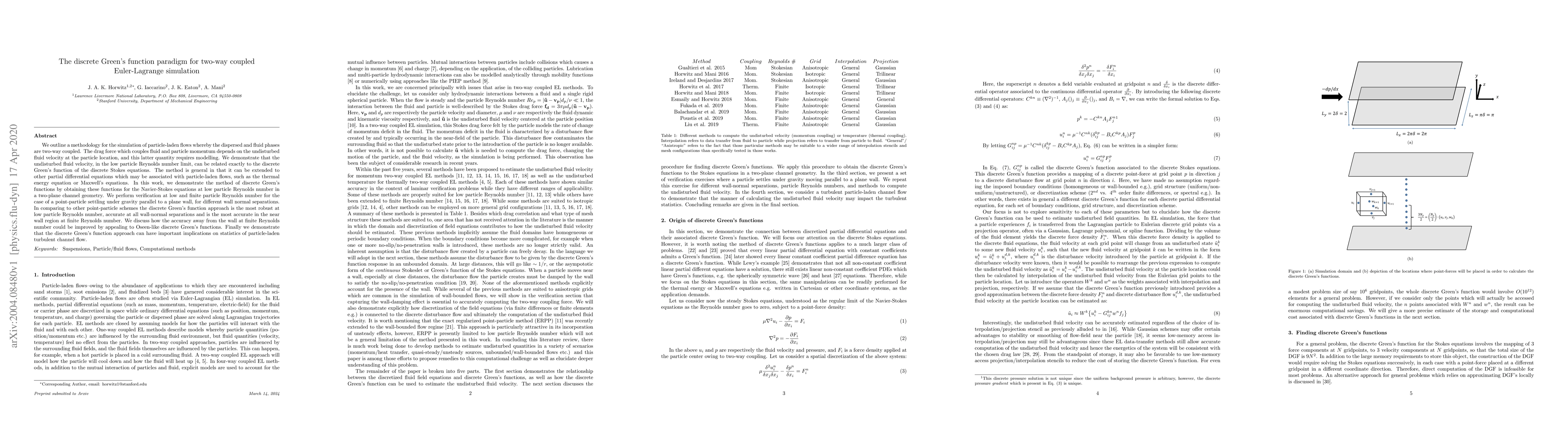 We outline a methodology for the simulation of particle-laden flows whereby the dispersed and fluid phases are two-way coupled. The drag force which couples fluid and particle momentum depends on the undisturbed fluid velocity at the particle location, and this latter quantity requires modelling. We demonstrate that the undisturbed fluid velocity, in the low particle Reynolds number limit, can be related exactly to the discrete Green's function of the discrete Stokes equations. The method is general in that it can be extended to other partial differential equations which may be associated with particle-laden flows, such as the thermal energy equation or Maxwell's equations. In this work, we demonstrate the method of discrete Green's functions by obtaining these functions for the Navier-Stokes equations at low particle Reynolds number in a two-plane channel geometry. We perform verification at low and finite particle Reynolds number for the case of a point-particle settling under gravity parallel to a plane wall, for different wall normal separations. In comparing to other point-particle schemes the discrete Green's function approach is the most robust at low particle Reynolds number, accurate at all wall-normal separations and is the most accurate in the near wall region at finite Reynolds number. We discuss how the accuracy away from the wall at finite Reynolds number could be improved by appealing to Oseen-like discrete Green's functions. Finally we demonstrate that the discrete Green's function approach can have important implications on statistics of particle-laden turbulent channel flow.
