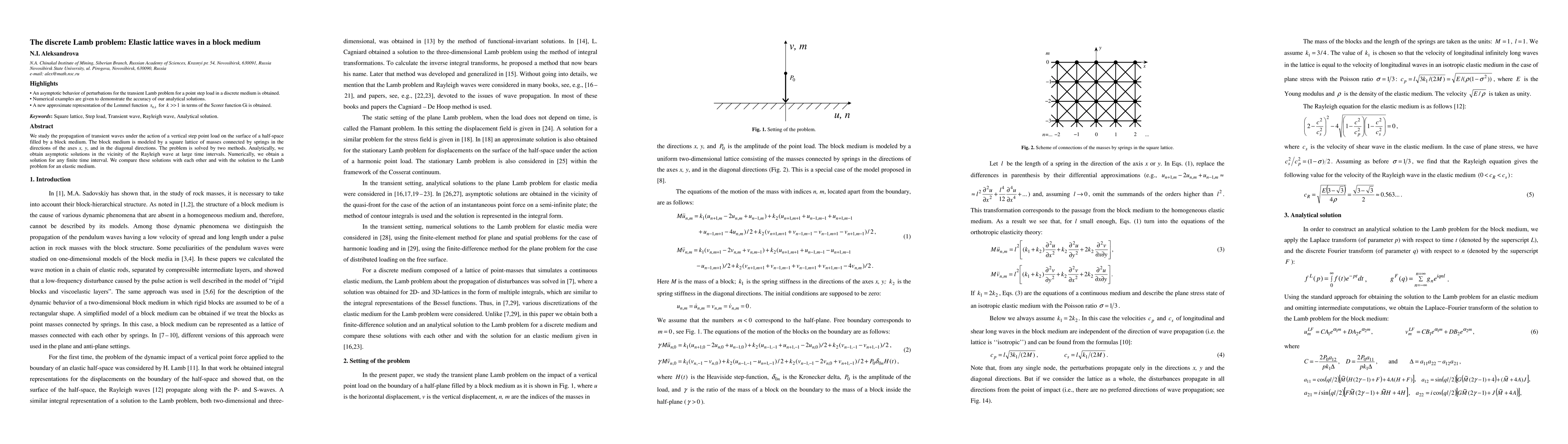 This paper investigates the transient wave propagation in a block medium modeled by a square lattice under a vertical step point load. Analytical and numerical methods are employed to derive solutions, which are compared to the Lamb problem for an elastic medium.