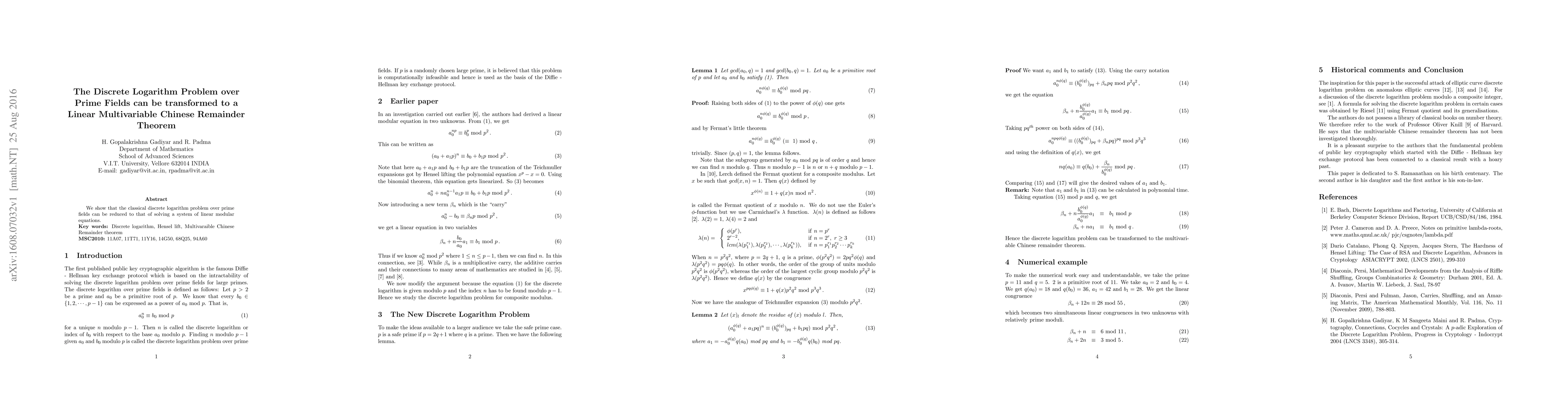 We show that the classical discrete logarithm problem over prime fields can be reduced to that of solving a system of linear modular equations.