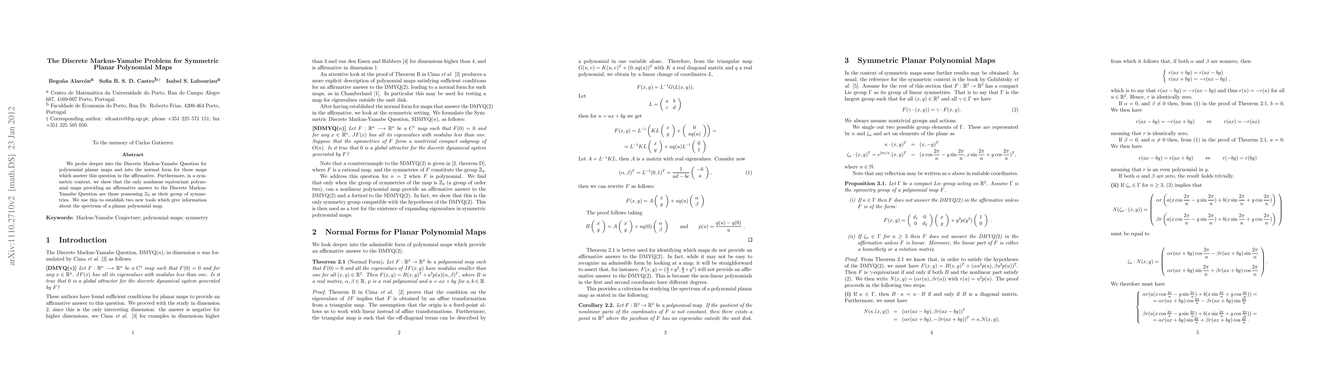 We probe deeper into the Discrete Markus-Yamabe Question for polynomial planar maps and into the normal form for those maps which answer this question in the affirmative. Furthermore, in a symmetric context, we show that the only nonlinear equivariant polynomial maps providing an affirmative answer to the Discrete Markus-Yamabe Question are those possessing Z2 as their group of symmetries. We use this to establish two new tools which give information about the spectrum of a planar polynomial map.