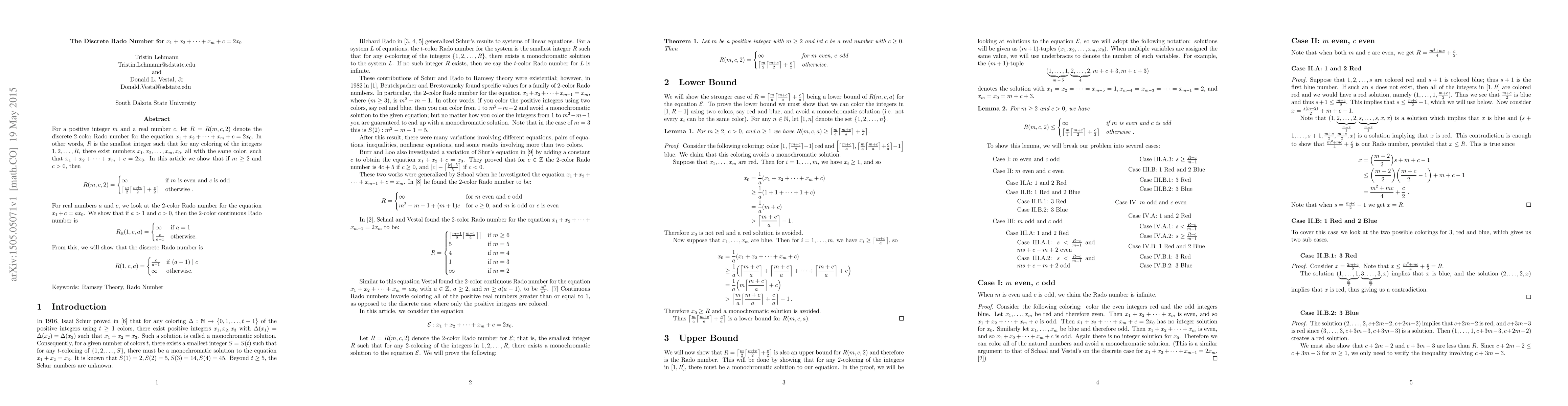 For a positive integer $m$ and a real number $c$, let $R = R(m,c,2)$ denote the discrete 2-color Rado number for the equation $x_1 + x_2 + \dots + x_m + c = 2x_0$. In other words, $R$ is the smallest integer such that for any coloring of the integers ${1, 2, \dots, R}$, there exist numbers $x_1, x_2, \dots, x_m, x_0$, all with the same color, such that $x_1 + x_2 + \dots + x_m + c = 2x_0$. In this article we show that if $m \geq 2$ and $c > 0$, then $$ \begin{array}{cc} R(m,c,2) = \begin{cases} \infty & \text{for $m$ even, $c$ odd} \newline \big\lceil \frac{m}{2} \big\lceil \frac{m+c}{2} \big\rceil + \frac{c}{2} \big\rceil & \text{otherwise.} \end{cases} \end{array} $$ For real numbers $a$ and $c$, we look at the 2-color Rado number for the equation $x_1 + c = ax_0$. We show that if $a > 1$ and $c > 0$, then the 2-color continuous Rado number is $$ R_\mathbb{R}(1, c, a) = \begin{cases} \infty & \text{if $a=1$ } \newline \frac{c}{a-1} & \text{otherwise.} \end{cases} $$ From this, we will show that the discrete Rado number is $$ R(1, c, a) = \begin{cases} \frac{c}{a-1} & \text{if $ \left( a-1 \right) \mid c$} \newline \infty & \text{otherwise.} \end{cases} $$