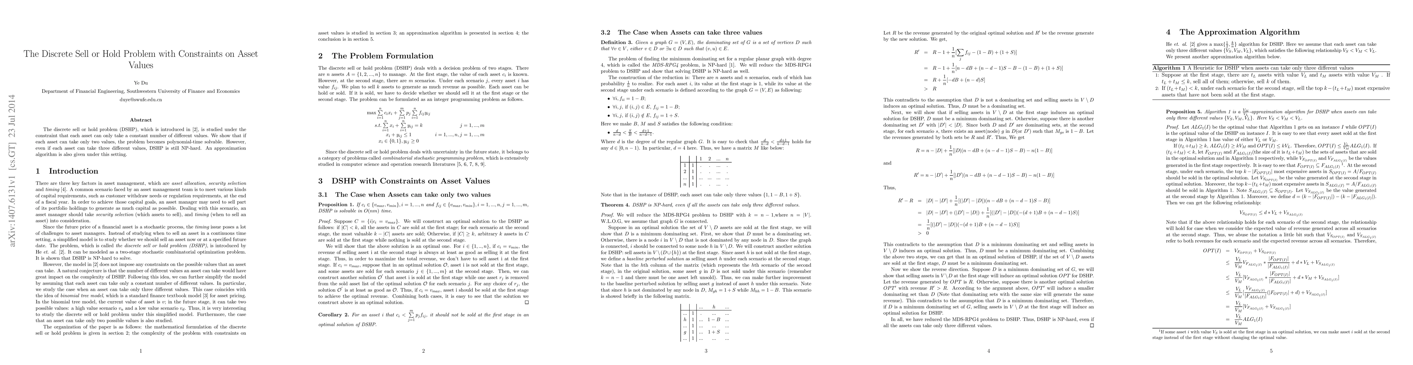 Researchers solved the discrete sell or hold problem with constraints on asset values, showing that it can be solved in polynomial time when each asset only takes two values, but remains NP-hard for three possible values. An approximation algorithm was also provided.
