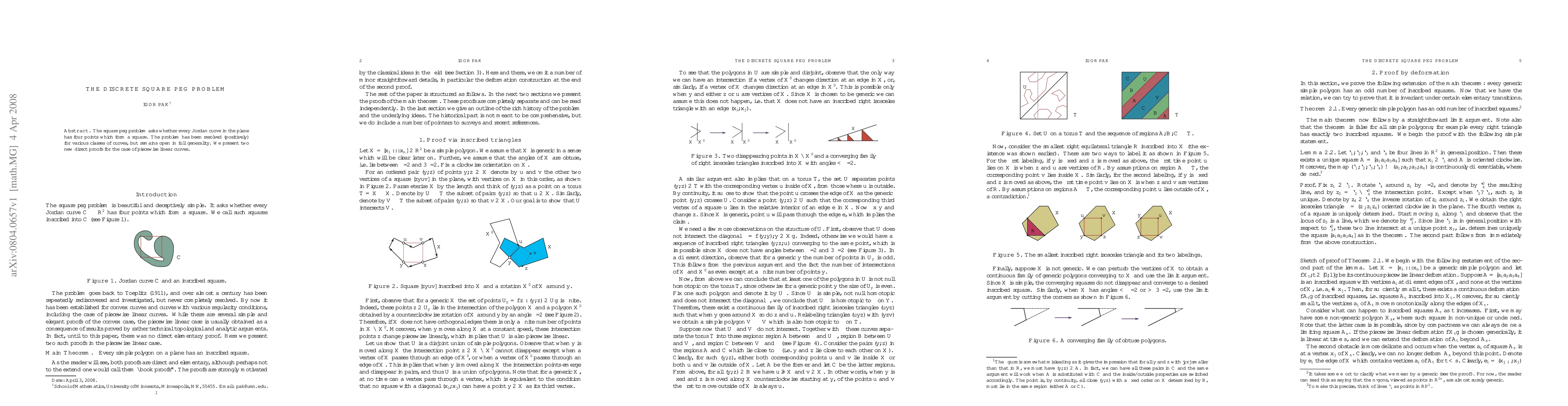 The discrete square peg problem explores whether every Jordan curve in the plane contains four points forming a square. Recent work provides new direct proofs confirming the existence for piecewise linear curves, although the general case remains unresolved.