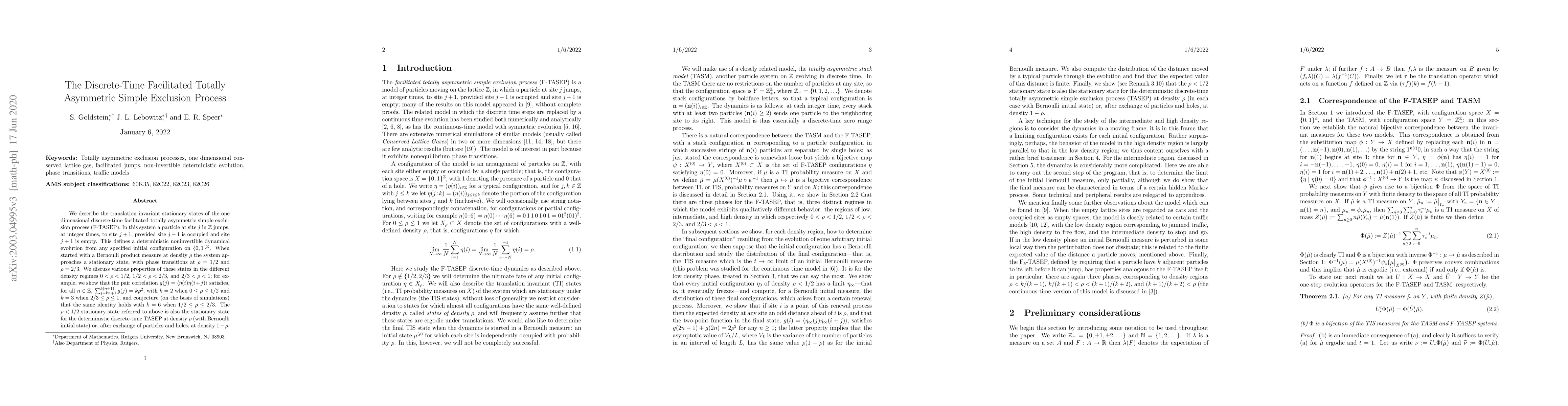 We describe the translation invariant stationary states of the one dimensional discrete-time facilitated totally asymmetric simple exclusion process (F-TASEP). In this system a particle at site $j$ in $Z$ jumps, at integer times, to site $j+1$, provided site $j-1$ is occupied and site $j+1$ is empty. This defines a deterministic noninvertible dynamical evolution from any specified initial configuration on $\{0,1\}^{Z}$. When started with a Bernoulli product measure at density $\rho$ the system approaches a stationary state, with phase transitions at $\rho=1/2$ and $\rho=2/3$. We discuss various properties of these states in the different density regimes $0<\rho<1/2$, $1/2<\rho<2/3$, and $2/3<\rho<1$; for example, we show that the pair correlation $g(j)=\langle\eta(i)\eta(i+j)\rangle$ satisfies, for all $n\in Z$, $\sum_{j=kn+1}^{k(n+1)}g(j)=k\rho^2$, with $k=2$ when $0 \le \rho \le 1/2$ and $k=3$ when $2/3 \le \rho \le 1$, and conjecture (on the basis of simulations) that the same identity holds with $k=6$ when $1/2 \le \rho \le 2/3$. The $\rho<1/2$ stationary state referred to above is also the stationary state for the deterministic discrete-time TASEP at density $\rho$ (with Bernoulli initial state) or, after exchange of particles and holes, at density $1-\rho$.