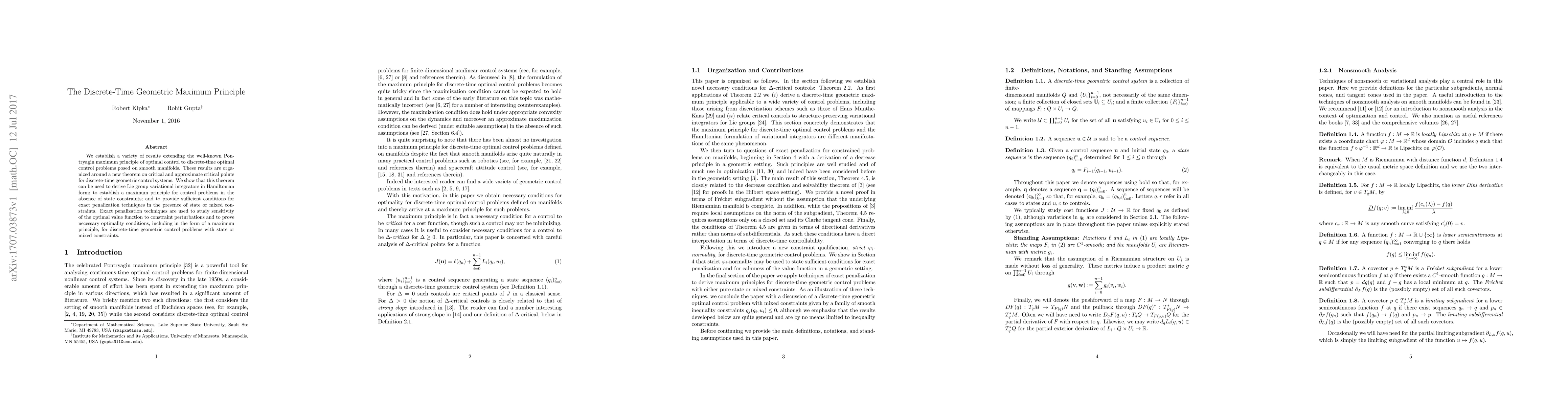 We establish a variety of results extending the well-known Pontryagin maximum principle of optimal control to discrete-time optimal control problems posed on smooth manifolds. These results are organized around a new theorem on critical and approximate critical points for discrete-time geometric control systems. We show that this theorem can be used to derive Lie group variational integrators in Hamiltonian form; to establish a maximum principle for control problems in the absence of state constraints; and to provide sufficient conditions for exact penalization techniques in the presence of state or mixed constraints. Exact penalization techniques are used to study sensitivity of the optimal value function to constraint perturbations and to prove necessary optimality conditions, including in the form of a maximum principle, for discrete-time geometric control problems with state or mixed constraints.