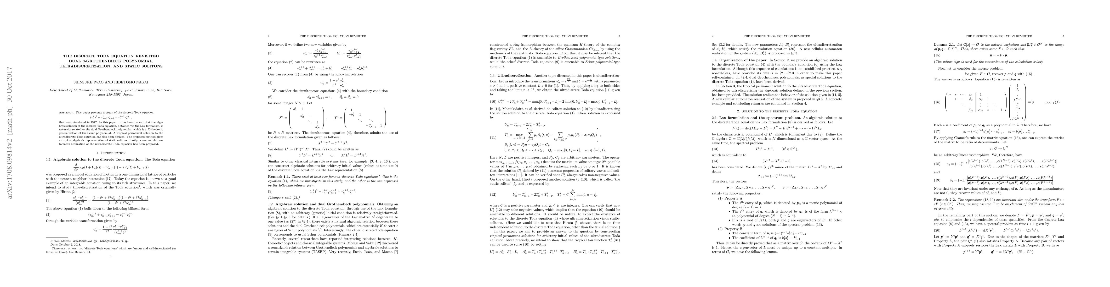 This paper presents a study of the discrete Toda equation $(\tau_n^t)^2+\tau_{n-1}^t\tau_{n+1}^t=\tau_n^{t-1}\tau_n^{t+1}$, that was introduced in 1977. In this paper, it has been proved that the algebraic solution of the discrete Toda equation, obtained via the Lax formalism, is naturally related to the dual Grothendieck polynomial, which is a $K$-theoretic generalization of the Schur polynomial. A tropical permanent solution to the ultradiscrete Toda equation has also been derived. The proposed method gives a tropical algebraic representation of static solitons. Lastly, a new cellular automaton realization of the ultradiscrete Toda equation has been proposed.