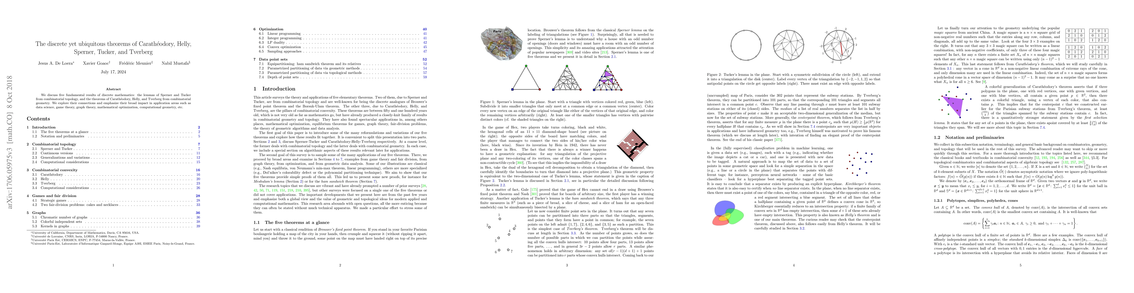 This paper examines five discrete theorems—Carathéodory, Helly, Sperner, Tucker, and Tverberg—from combinatorial topology and geometry, highlighting their interconnections and their significant applications in fields like game theory, graph theory, and optimization.