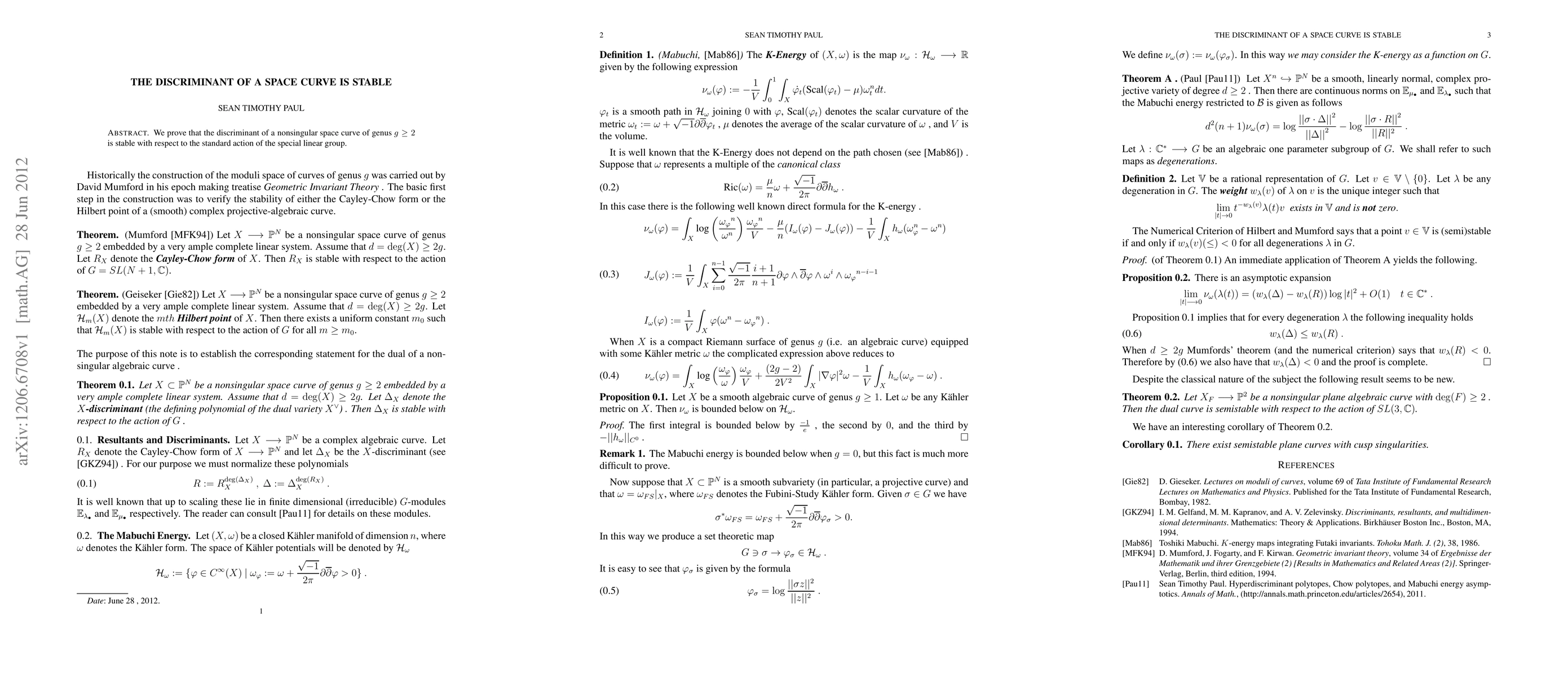 We prove that the discriminant of a nonsingular space curve of genus $g\geq 2$ is stable with respect to the standard action of the special linear group.