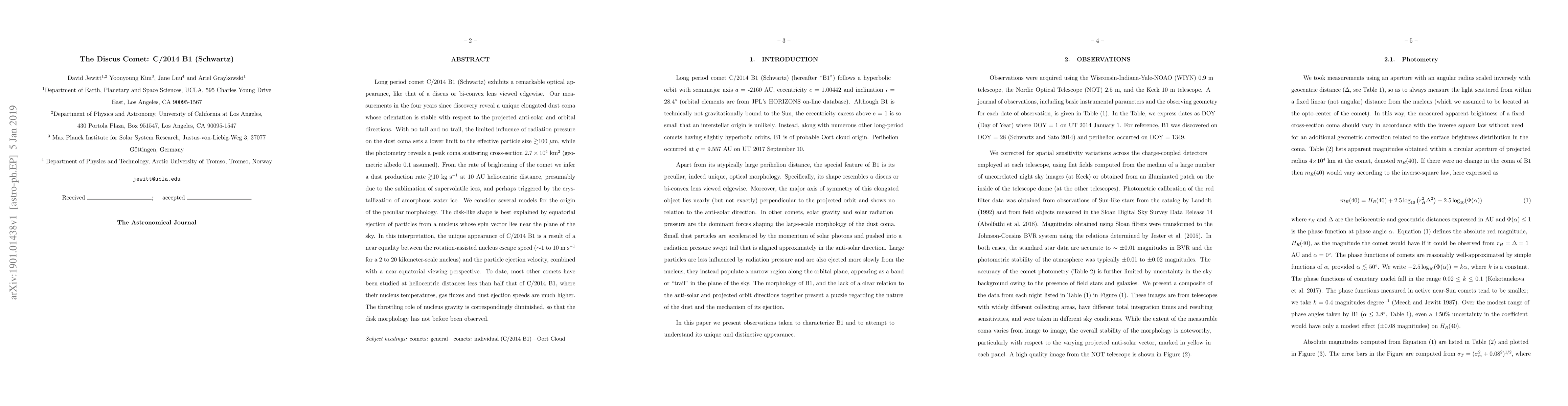 Long period comet C/2014 B1 (Schwartz) exhibits a remarkable optical appearance, like that of a discus or bi-convex lens viewed edgewise. Our measurements in the four years since discovery reveal a unique elongated dust coma whose orientation is stable with respect to the projected anti-solar and orbital directions. With no tail and no trail, the limited influence of radiation pressure on the dust coma sets a lower limit to the effective particle size of 0.1 mm, while the photometry reveals a peak coma scattering cross-section 27,000 sq km (geometric albedo 0.1 assumed). From the rate of brightening of the comet we infer a dust production rate of order 10 kg/s at 10 AU heliocentric distance, presumably due to the sublimation of supervolatile ices, and perhaps triggered by the crystallization of amorphous water ice. We consider several models for the origin of the peculiar morphology. The disk-like shape is best explained by equatorial ejection of particles from a nucleus whose spin vector lies near the plane of the sky. In this interpretation, the unique appearance of C/2014 B1 is a result of a near equality between the rotation-assisted nucleus escape speed (1 to 10 m/s for a 2 to 20 kilometer-scale nucleus) and the particle ejection velocity, combined with a near-equatorial viewing perspective. To date, most other comets have been studied at heliocentric distances less than half that of C/2014 B1, where their nucleus temperatures, gas fluxes and dust ejection speeds are much higher. The throttling role of nucleus gravity is correspondingly diminished, so that the disk morphology has not before been observed.
