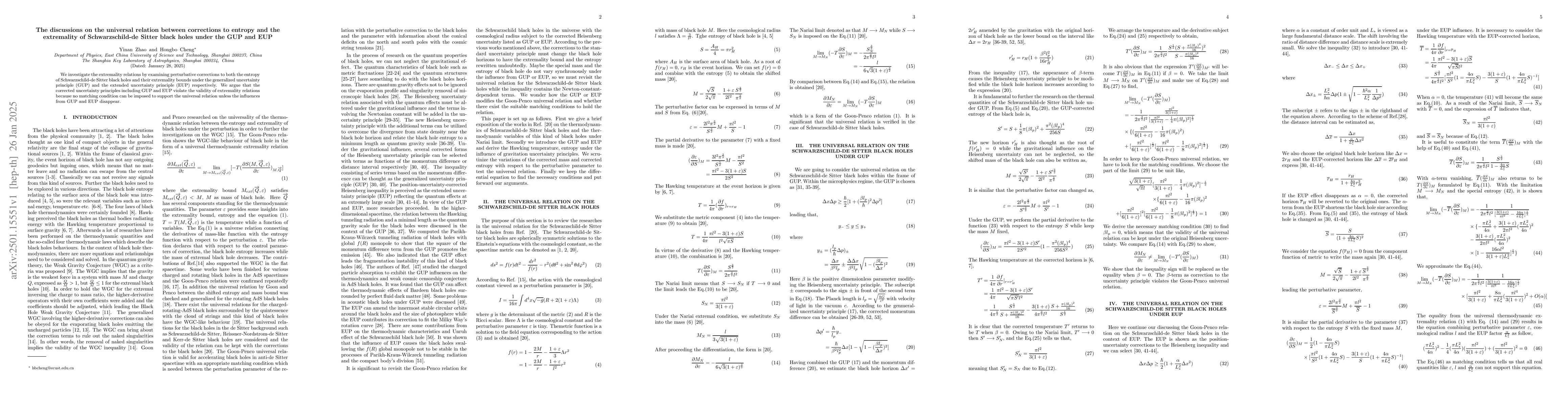 Summary: This study examines perturbative corrections to Schwarzschild-de Sitter black hole entropy and extremality under GUP and EUP, concluding that these corrected uncertainty principles undermine the validity of extremality relations due to the lack of a matching condition.