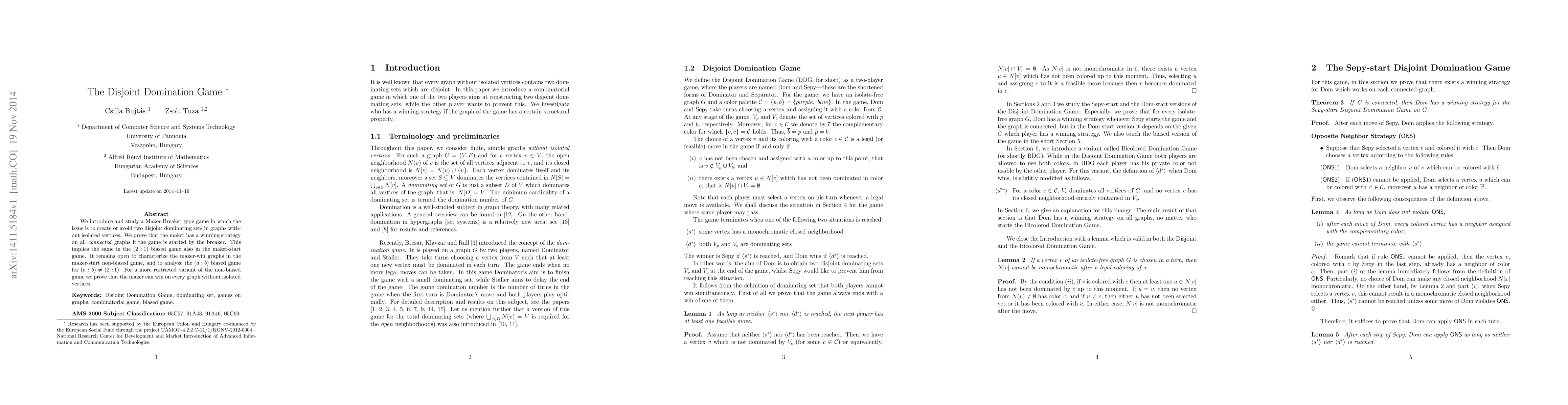 We introduce and study a Maker-Breaker type game in which the issue is to create or avoid two disjoint dominating sets in graphs without isolated vertices. We prove that the maker has a winning strategy on all connected graphs if the game is started by the breaker. This implies the same in the $(2:1)$ biased game also in the maker-start game. It remains open to characterize the maker-win graphs in the maker-start non-biased game, and to analyze the $(a:b)$ biased game for $(a:b)\neq (2:1)$. For a more restricted variant of the non-biased game we prove that the maker can win on every graph without isolated vertices.