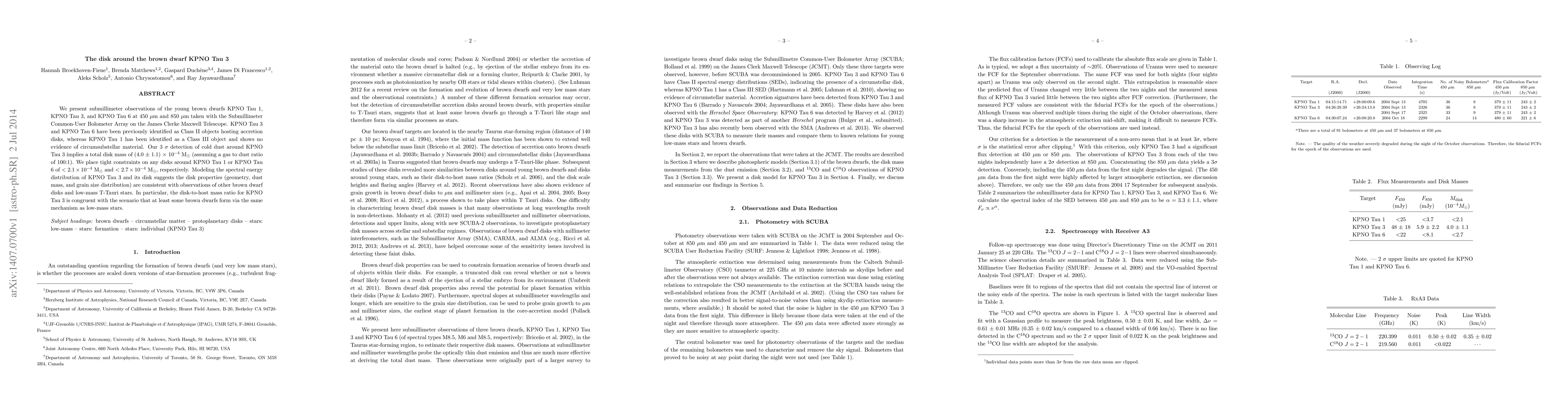 We present submillimeter observations of the young brown dwarfs KPNO Tau 1, KPNO Tau 3, and KPNO Tau 6 at 450 micron and 850 micron taken with the Submillimeter Common-User Bolometer Array on the James Clerke Maxwell Telescope. KPNO Tau 3 and KPNO Tau 6 have been previously identified as Class II objects hosting accretion disks, whereas KPNO Tau 1 has been identified as a Class III object and shows no evidence of circumsubstellar material. Our 3 sigma detection of cold dust around KPNO Tau 3 implies a total disk mass of (4.0 +/- 1.1) x 10^{-4} Msolar (assuming a gas to dust ratio of 100:1). We place tight constraints on any disks around KPNO Tau 1 or KPNO Tau 6 of <2.1 x 10^{-4} Msolar and <2.7 x 10^{-4} Msolar, respectively. Modeling the spectral energy distribution of KPNO Tau 3 and its disk suggests the disk properties (geometry, dust mass, and grain size distribution) are consistent with observations of other brown dwarf disks and low-mass T-Tauri stars. In particular, the disk-to-host mass ratio for KPNO Tau 3 is congruent with the scenario that at least some brown dwarfs form via the same mechanism as low-mass stars.