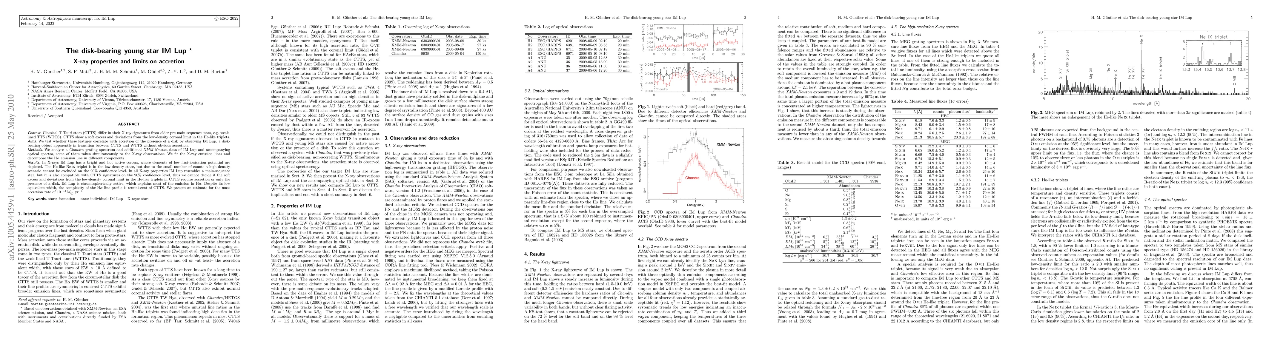 The research investigates the X-ray properties of the disk-bearing young star IM Lup, finding it exhibits a bright and hot active corona, resembling both classical T Tauri stars and main-sequence stars, but the exact nature of its X-ray features remains ambiguous regarding accretion or disk presence. The study estimates a low mass accretion rate of 10e-11 Msun/yr.