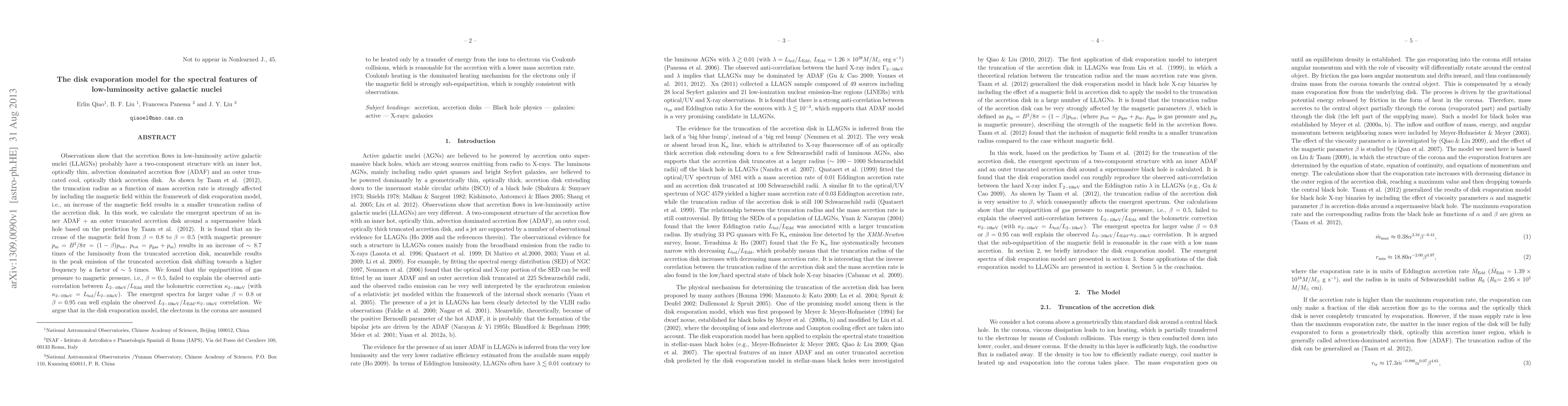 Observations show that the accretion flows in low-luminosity active galactic nuclei (LLAGNs) probably have a two-component structure with an inner ADAF and an outer truncated accretion disk. As shown by Taam et al. (2012), the truncation radius as a function of mass accretion rate is strongly affected by including the magnetic field within the framework of disk evaporation model, i.e., an increase of the magnetic field results in a smaller truncation radius of the accretion disk. In this work, we calculate the emergent spectrum of an inner ADAF + an outer truncated accretion disk around a supermassive black hole based on the prediction by Taam et al. (2012). It is found that an increase of the magnetic field from $\beta=0.8$ to $\beta=0.5$ (with magnetic pressure $p_{\rm m}=B^2/{8\pi}=(1-\beta)p_{\rm tot}$, $p_{\rm tot}=p_{\rm gas}+p_{\rm m}$) results in an increase of $\sim 8.7$ times of the luminosity from the truncated accretion disk. We found that the equipartition of gas pressure to magnetic pressure, i.e., $\beta=0.5$, failed to explain the observed anti-correlation between $L_{\rm 2-10 keV}/L_{\rm Edd}$ and the bolometric correction $\kappa_{\rm 2-10 keV}$ (with $\kappa_{\rm 2-10 keV} = L_{\rm bol}/L_{\rm 2-10 keV}$). The emergent spectra for larger value $\beta=0.8$ or $\beta=0.95$ can well explain the observed $L_{\rm 2-10 keV}/L_{\rm Edd}$-$\kappa_{\rm 2-10 keV}$ correlation. We argue that in the disk evaporation model, the electrons in the corona are assumed to be heated only by a transfer of energy from the ions to electrons via Coulomb collisions, which is reasonable for the accretion with a lower mass accretion rate. Coulomb heating is the dominated heating mechanism for the electrons only if the magnetic field is strongly sub-equipartition, which is roughly consistent with observations.