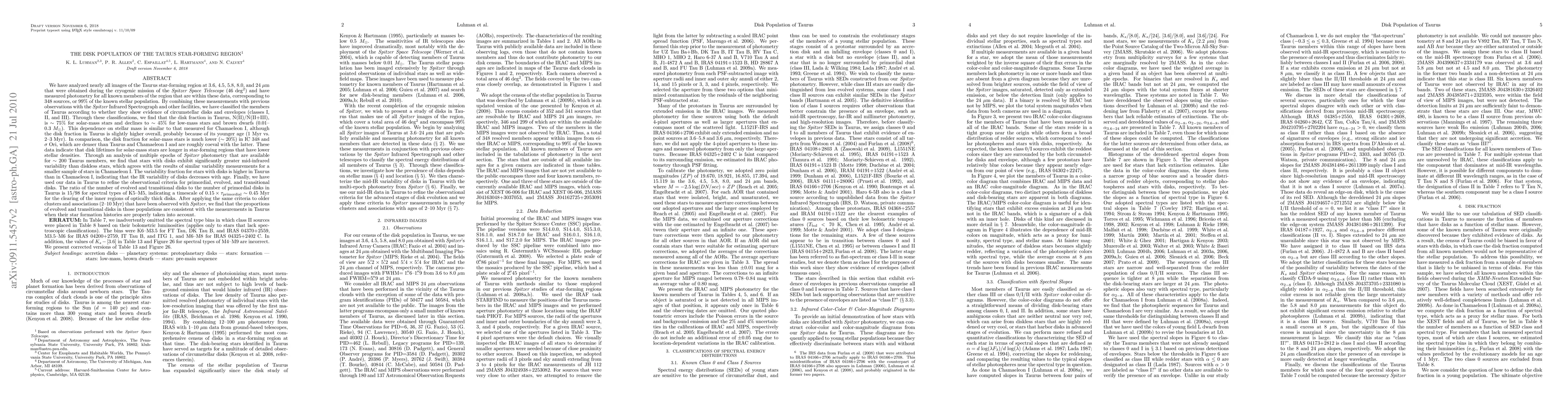 This study analyzes Spitzer Space Telescope data to classify the disk populations in the Taurus star-forming region, finding a 75% disk fraction for solar-mass stars that declines to 45% for lower-mass stars. The research indicates longer disk lifetimes in less dense regions and greater mid-IR variability in disk-bearing stars.