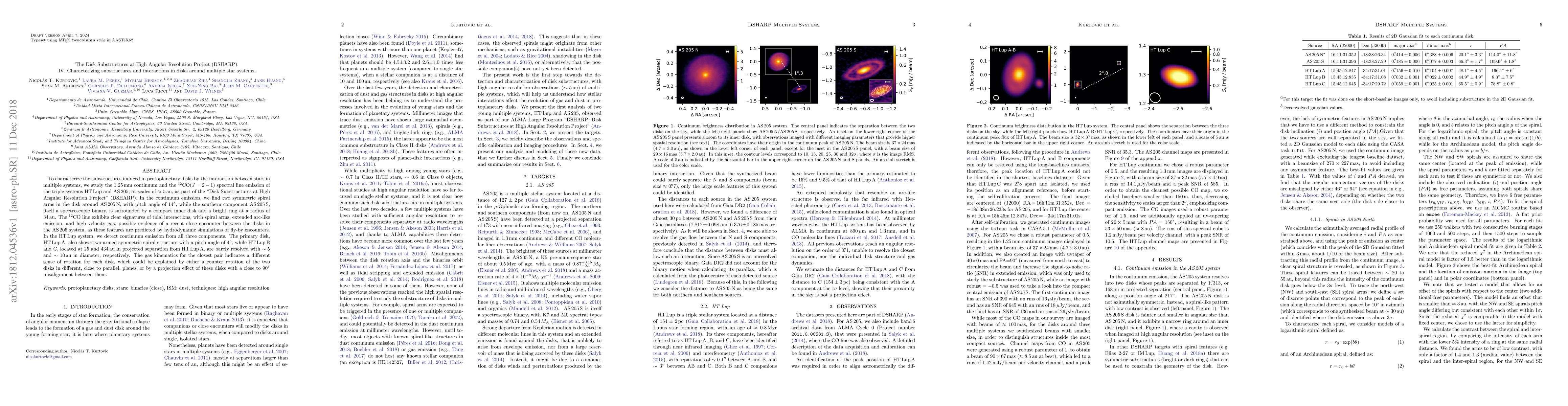 To characterize the substructures induced in protoplanetary disks by the interaction between stars in multiple systems, we study the $1.25\,$mm continuum and the $^{12}$CO$(J=2-1)$ spectral line emission of the triple systems HT Lup and AS 205, at scales of $\approx 5\,$au, as part of the 'Disk Substructures at High Angular Resolution Project' (DSHARP). In the continuum emission, we find two symmetric spiral arms in the disk around AS 205 N, with pitch angle of $14^\circ$, while the southern component AS 205 S, itself a spectroscopic binary, is surrounded by a compact inner disk and a bright ring at a radius of $34\,$au. The $^{12}$CO line exhibits clear signatures of tidal interactions, with spiral arms, extended arc-like emission, and high velocity gas, possible evidence of a recent close encounter between the disks in the AS 205 system, as these features are predicted by hydrodynamic simulations of fly-by encounters. In the HT Lup system, we detect continuum emission from all three components. The primary disk, HT Lup A, also shows two-armed symmetric spiral structure with a pitch angle of $4^\circ$, while HT Lup B and C, located at $25$ and $434\,$au in projected separation from HT Lup A, are barely resolved with $\sim5$ and $\sim10\,$au in diameter, respectively. The gas kinematics for the closest pair indicates a different sense of rotation for each disk, which could be explained by either a counter rotation of the two disks in different, close to parallel, planes, or by a projection effect of these disks with a close to $90^\circ$ misalignment between them.