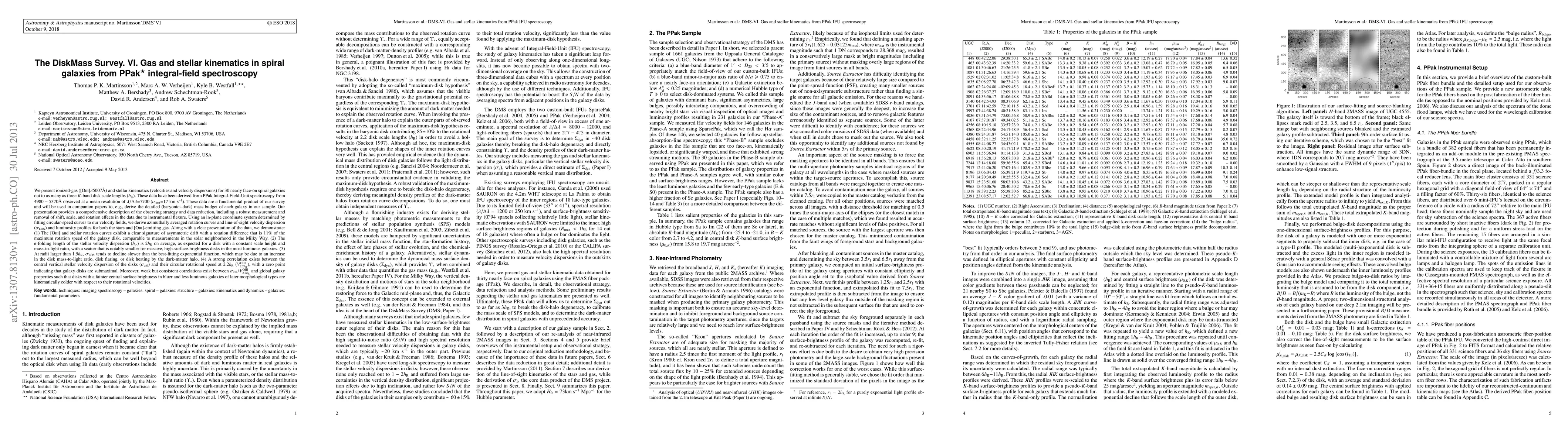 We present ionized-gas (OIII) and stellar kinematics (velocities and velocity dispersions) for 30 nearly face-on spiral galaxies out to as much as three disk scale lengths (h_R). These data have been derived from PPak IFU spectroscopy (4980-5370A), observed at a mean resolution of R=7700 (sigma_inst=17km/s). These data are a fundamental product of our survey and will be used in companion papers to, e.g., derive the detailed (baryonic+dark) mass budget of each galaxy in our sample. Our presentation provides a comprehensive description of the observing strategy, data reduction, and analysis. Along with a clear presentation of the data, we demonstrate: (1) The OIII and stellar rotation curves exhibit a clear signature of asymmetric drift with a rotation difference that is 11% of the maximum rotation speed of the galaxy disk, comparable to measurements in the solar neighborhood in the Milky Way. (2) The e-folding length of the stellar velocity dispersion is two times h_R on average, as expected for a disk with a constant scale height and mass-to-light ratio, with a scatter that is notably smaller for massive, high-surface-brightness disks in the most luminous galaxies. (3) At radii larger than 1.5 h_R, the stellar velocity dispersion tends to decline slower than the best-fitting exponential function, which may be due to an increase in the disk mass-to-light ratio, disk flaring, or disk heating by the dark-matter halo. (4) A strong correlation exists between the central vertical stellar velocity dispersion of the disks and their circular rotational speed at 2.2 h_R, with a zero point indicating that galaxy disks are submaximal. Moreover, weak but consistent correlations exist such that disks with a fainter central surface brightness in bluer and less luminous galaxies of later morphological types are kinematically colder with respect to their rotational velocities.