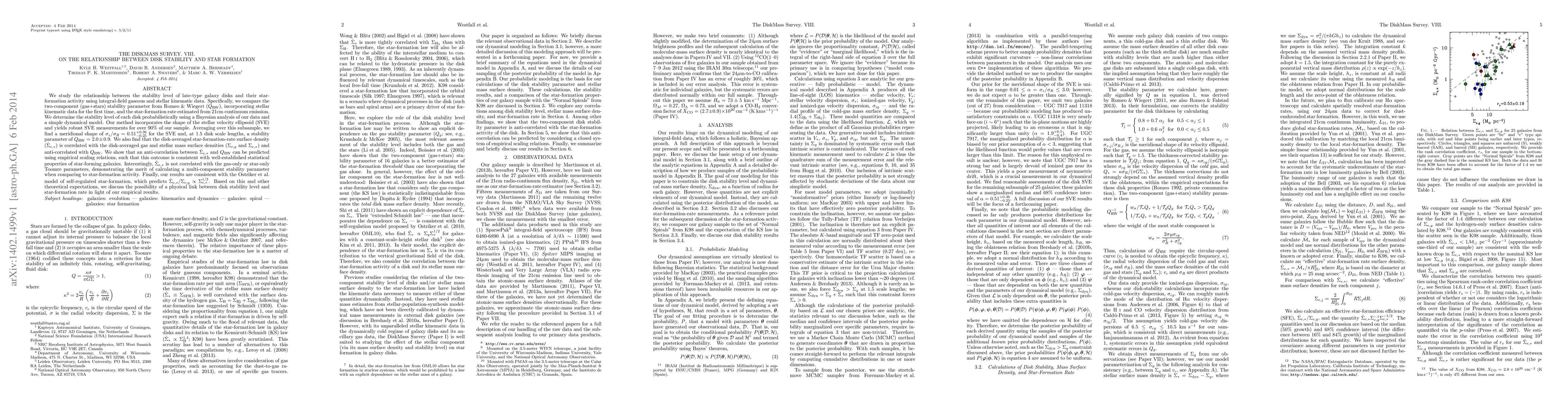 We study the relationship between the stability level of late-type galaxy disks and their star-formation activity using integral-field gaseous and stellar kinematic data. Specifically, we compare the two-component (gas+stars) stability parameter from Romeo & Wiegert (Q_RW), incorporating stellar kinematic data for the first time, and the star-formation rate estimated from 21cm continuum emission. We determine the stability level of each disk probabilistically using a Bayesian analysis of our data and a simple dynamical model. Our method incorporates the shape of the stellar velocity ellipsoid (SVE) and yields robust SVE measurements for over 90% of our sample. Averaging over this subsample, we find a meridional shape of sigma_z/sigma_R = 0.51^{+0.36}_{-0.25} for the SVE and, at 1.5 disk scale lengths, a stability parameter of Q_RW = 2.0 +/- 0.9. We also find that the disk-averaged star-formation-rate surface density (Sigma-dot_e,*) is correlated with the disk-averaged gas and stellar mass surface densities (Sigma_e,g and Sigma_e,*) and anti-correlated with Q_RW. We show that an anti-correlation between Sigma-dot_e,* and Q_RW can be predicted using empirical scaling relations, such that this outcome is consistent with well-established statistical properties of star-forming galaxies. Interestingly, Sigma-dot_e,* is not correlated with the gas-only or star-only Toomre parameters, demonstrating the merit of calculating a multi-component stability parameter when comparing to star-formation activity. Finally, our results are consistent with the Ostriker et al. model of self-regulated star-formation, which predicts Sigma-dot_e,*/Sigma_e,g/sqrt(Sigma_e,*). Based on this and other theoretical expectations, we discuss the possibility of a physical link between disk stability level and star-formation rate in light of our empirical results.