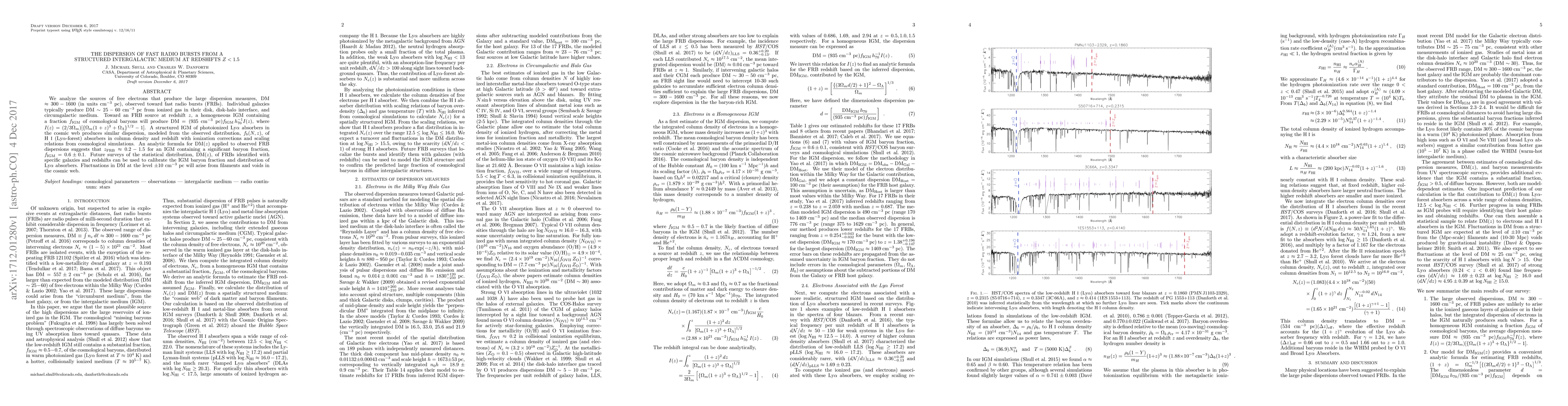 We analyze the sources of free electrons that produce the large dispersion measures, DM $\approx 300-1600$ (in units cm$^{-3}$ pc), observed toward fast radio bursts (FRBs). Individual galaxies typically produce DM $\sim 25-60$ cm$^{-3}$ pc from ionized gas in their disk, disk-halo interface, and circumgalactic medium. Toward an FRB source at redshift $z$, a homogeneous IGM containing a fraction $f_{\rm IGM}$ of cosmological baryons will produce DM $= (935~{\rm cm}^{-3}~{\rm pc}) f_{\rm IGM} \, h_{70}^{-1} I(z)$, where $I(z) = (2/3 \Omega_m)[ \{ \Omega_m(1+z)^3 + \Omega_{\Lambda} \}^{1/2} - 1 ]$. A structured IGM of photoionized Ly-alpha absorbers in the cosmic web produces similar dispersion, modeled from the observed distribution, $f_b(N,z)$, of H I (Lya-forest) absorbers in column density and redshift with ionization corrections and scaling relations from cosmological simulations. An analytic formula for DM($z$) applied to observed FRB dispersions suggests that $z_{\rm FRB} \approx 0.2-1.5$ for an IGM containing a significant baryon fraction, $f_{\rm IGM} = 0.6\pm0.1$. Future surveys of the statistical distribution, DM($z)$, of FRBs identified with specific galaxies and redshifts, can be used to calibrate the IGM baryon fraction and distribution of Ly-alpha absorbers. Fluctuations in DM at the level $\pm10$ cm$^{-3}$ pc will arise from filaments and voids in the cosmic web.