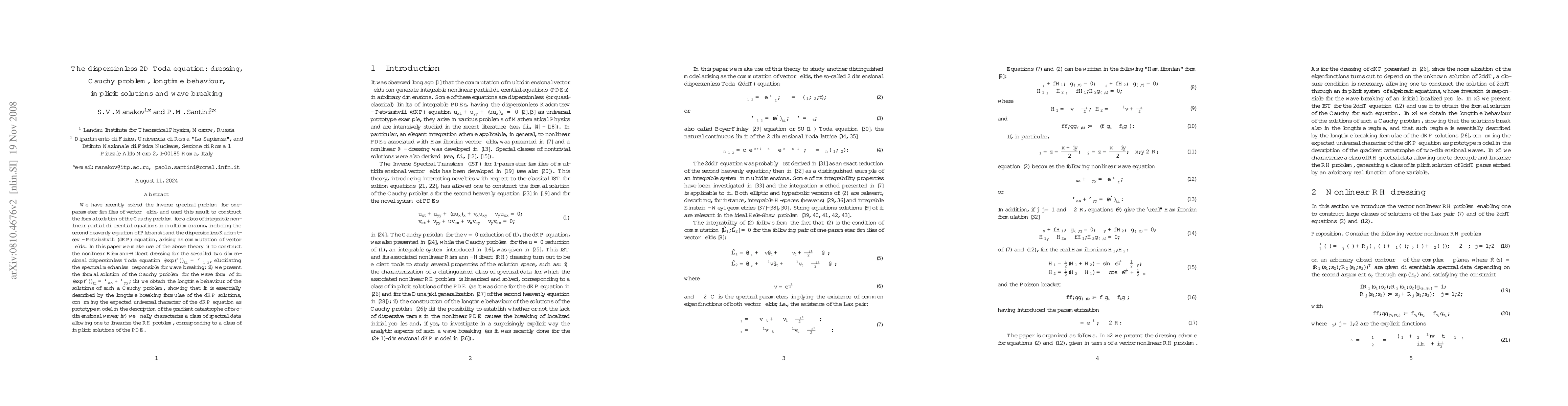 We have recently solved the inverse spectral problem for one-parameter families of vector fields, and used this result to construct the formal solution of the Cauchy problem for a class of integrable nonlinear partial differential equations in multidimensions, including the second heavenly equation of Plebanski and the dispersionless Kadomtsev - Petviashvili (dKP) equation, arising as commutation of vector fields. In this paper we make use of the above theory i) to construct the nonlinear Riemann-Hilbert dressing for the so-called two dimensional dispersionless Toda equation $(exp(\phi))_{tt}=\phi_{\zeta_1\zeta_2}$, elucidating the spectral mechanism responsible for wave breaking; ii) we present the formal solution of the Cauchy problem for the wave form of it: $(exp(\phi))_{tt}=\phi_{xx}+\phi_{yy}$; iii) we obtain the longtime behaviour of the solutions of such a Cauchy problem, showing that it is essentially described by the longtime breaking formulae of the dKP solutions, confirming the expected universal character of the dKP equation as prototype model in the description of the gradient catastrophe of two-dimensional waves; iv) we finally characterize a class of spectral data allowing one to linearize the RH problem, corresponding to a class of implicit solutions of the PDE.