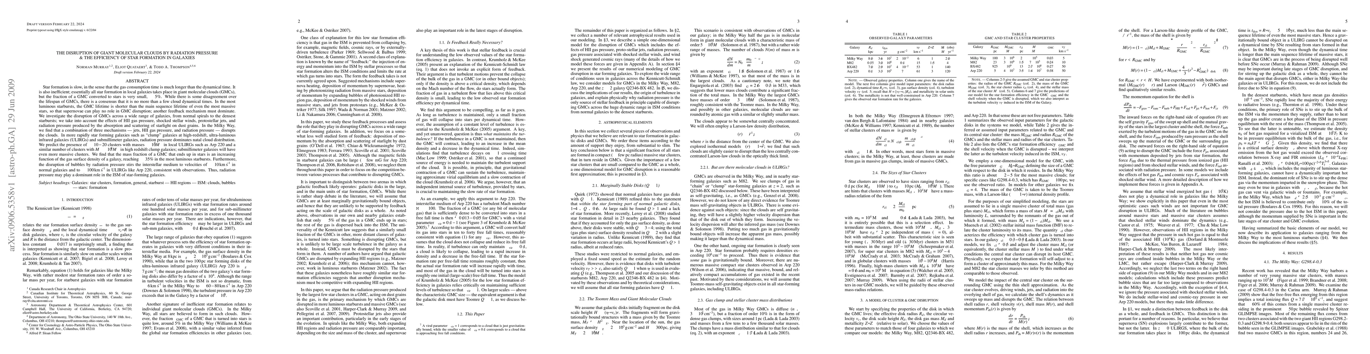 Star formation is slow, in the sense that the gas consumption time is much longer than the dynamical time. It is also inefficient; essentially all star formation in local galaxies takes place in giant molecular clouds (GMCs), but the fraction of a GMC converted to stars is very small, ~5%. In the most luminous starbursts, the GMC lifetime is shorter than the main sequence lifetime of even the most massive stars, so that supernovae can play no role in GMC disruption. We investigate the disruption of GMCs across a wide range of galaxies, from normal spirals to the densest starbursts; we take into account the effects of HII gas pressure, shocked stellar winds, protostellar jets, and radiation pressure produced by the absorption and scattering of starlight on dust grains. In the Milky Way, we find that a combination of three mechanisms, jets, HII gas pressure, and radiation pressure, disrupts the clouds. In more rapidly star forming galaxies such as ``clump'' galaxies at high-redshift, ultra-luminous infrared galaxies (ULIRGs) and submillimeter galaxies, radiation pressure dominates natal cloud distribution. We predict the presence of 10-20 clusters with masses ~10^7 Msun in local ULIRGs such as Arp 220 and a similar number of clusters with M_* ~ 10^8 Msun in high redshift clump galaxies; submillimeter galaxies will have even more massive clusters. We find that the mass fraction of a GMC that ends up in stars is an increasing function of the gas surface density of a galaxy, reaching ~35% in the most luminous starbursts. Furthermore, the disruption of bubbles by radiation pressure stirs the interstellar medium to velocities of ~10 km/s in normal galaxies and to ~100 km/s in ULIRGs like Arp 220, consistent with observations. Thus, radiation pressure may play a dominant role in the ISM of star-forming galaxies.