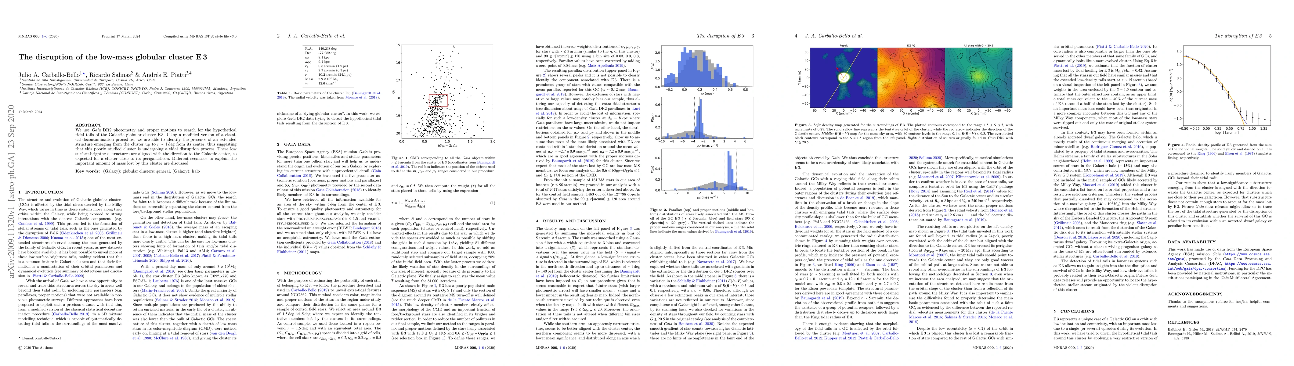 The study identifies extended tidal tails around the low-mass globular cluster E3 using Gaia DR2 data, indicating ongoing tidal disruption. The low surface-brightness structures align with the Galactic center, suggesting the cluster is near its perigalacticon.