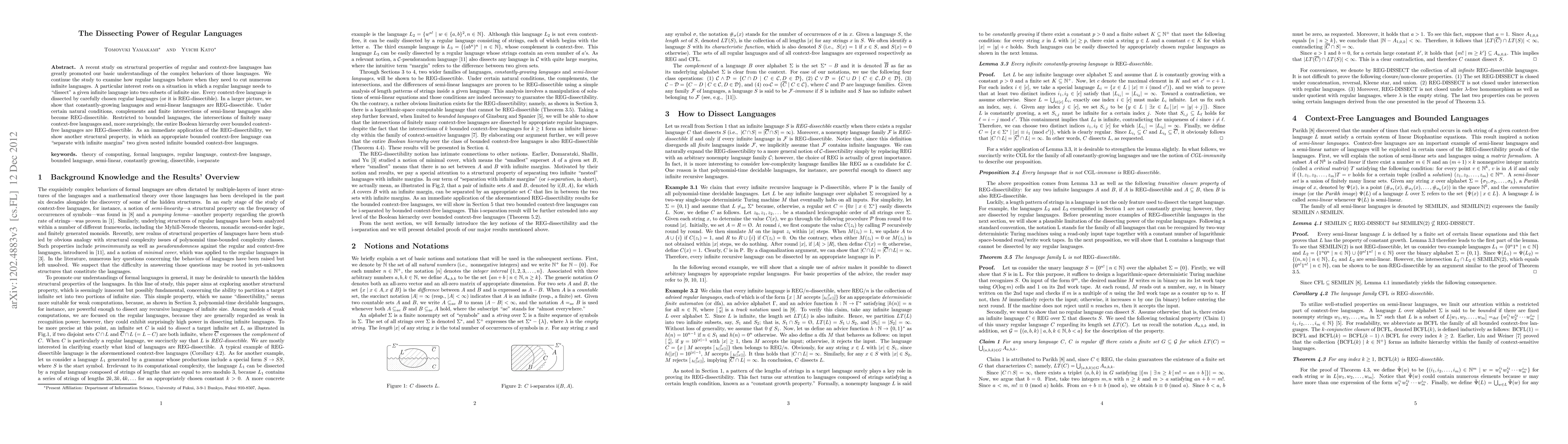 A recent study on structural properties of regular and context-free languages has greatly promoted our basic understandings of the complex behaviors of those languages. We continue the study to examine how regular languages behave when they need to cut numerous infinite languages. A particular interest rests on a situation in which a regular language needs to "dissect" a given infinite language into two subsets of infinite size. Every context-free language is dissected by carefully chosen regular languages (or it is REG-dissectible). In a larger picture, we show that constantly-growing languages and semi-linear languages are REG-dissectible. Under certain natural conditions, complements and finite intersections of semi-linear languages also become REG-dissectible. Restricted to bounded languages, the intersections of finitely many context-free languages and, more surprisingly, the entire Boolean hierarchy over bounded context-free languages are REG-dissectible. As an immediate application of the REG-dissectibility, we show another structural property, in which an appropriate bounded context-free language can "separate with infinite margins" two given nested infinite bounded context-free languages.