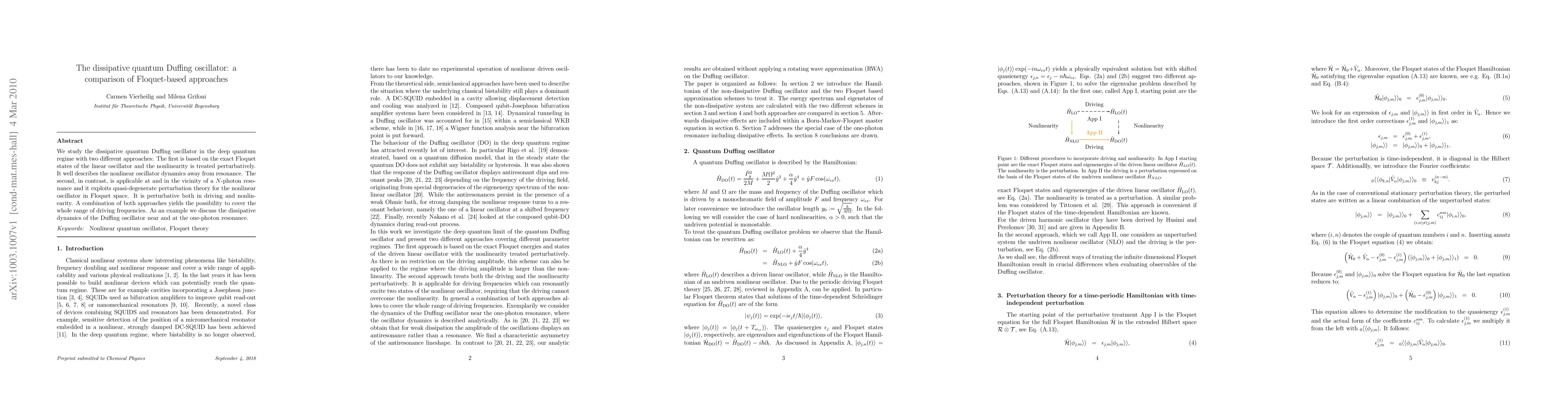 We study the dissipative quantum Duffing oscillator in the deep quantum regime with two different approaches: The first is based on the exact Floquet states of the linear oscillator and the nonlinearity is treated perturbatively. It well describes the nonlinear oscillator dynamics away from resonance. The second, in contrast, is applicable at and in the vicinity of a N-photon resonance and it exploits quasi-degenerate perturbation theory for the nonlinear oscillator in Floquet space. It is perturbative both in driving and nonlinearity. A combination of both approaches yields the possibility to cover the whole range of driving frequencies. As an example we discuss the dissipative dynamics of the Duffing oscillator near and at the one-photon resonance.