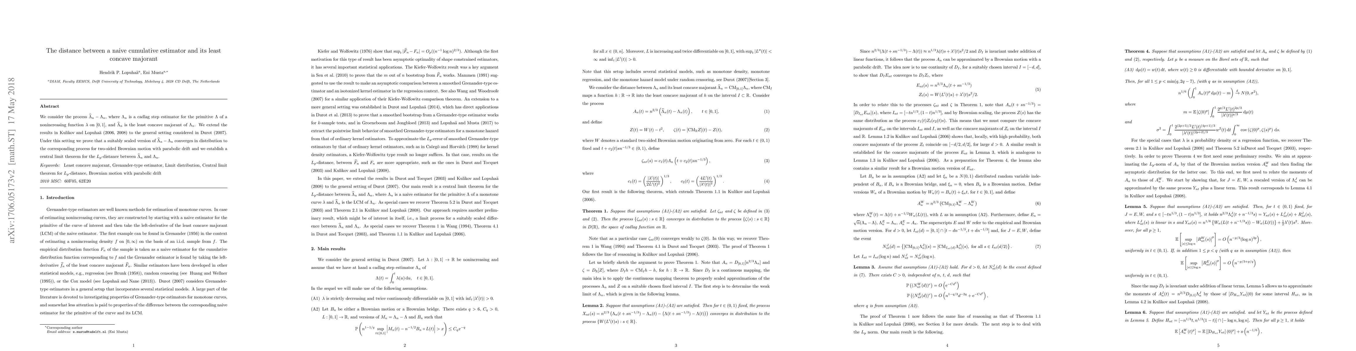 This paper investigates the difference between a naive cumulative estimator $\Lambda_n$ and its least concave majorant $\widehat\Lambda_n$. It extends previous results to a broader setting and proves convergence in distribution to a process involving two-sided Brownian motion with parabolic drift, along with a central limit theorem for the $L_p$-distance between $\widehat\Lambda_n$ and $\Lambda_n$.