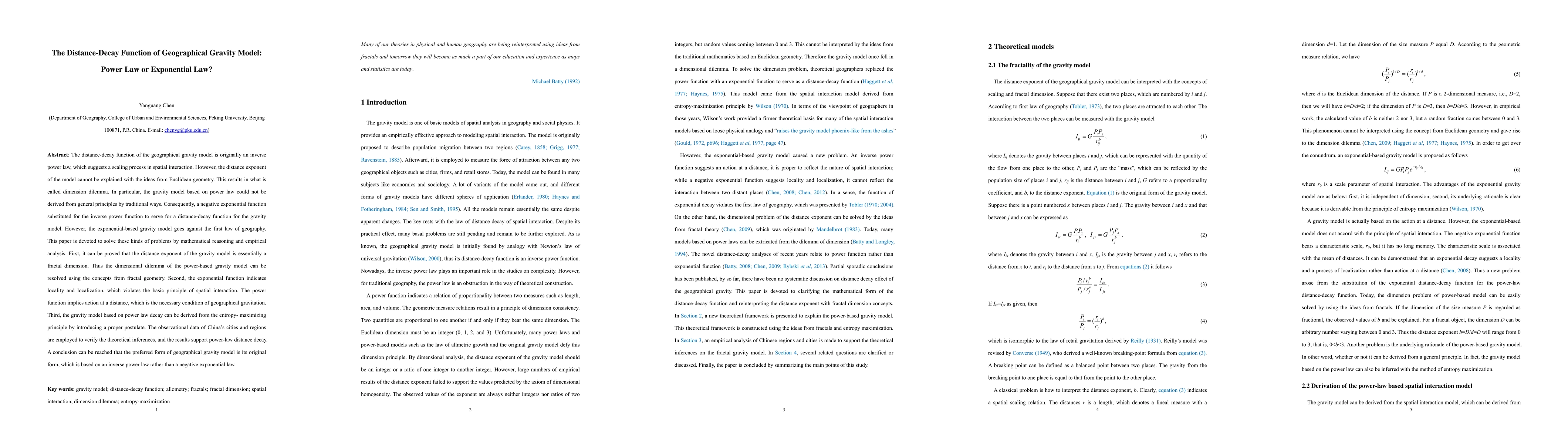 This paper argues that the geographical gravity model should use an inverse power law for its distance-decay function rather than an exponential function, resolving the dimension dilemma with fractal geometry and supporting the model with empirical data from China's cities.