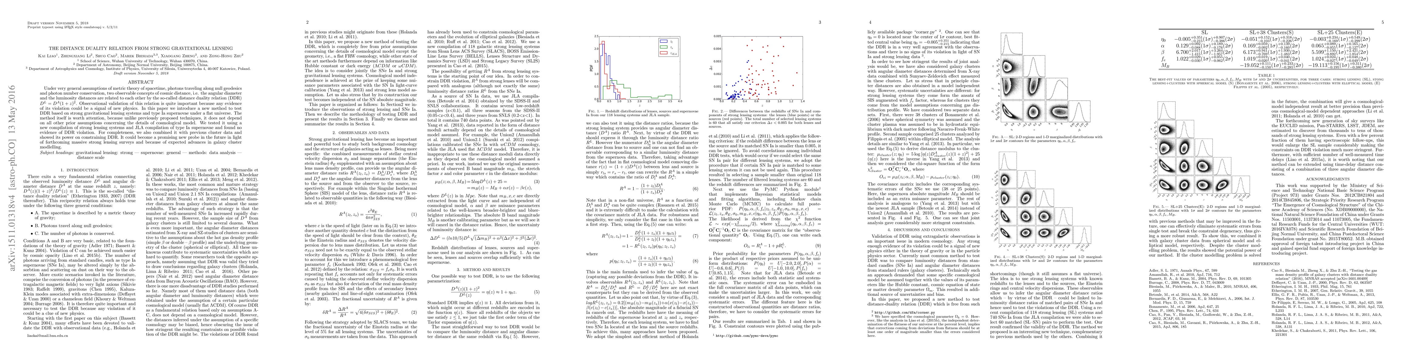 Under very general assumptions of metric theory of spacetime, photons traveling along null geodesics and photon number conservation, two observable concepts of cosmic distance, i.e. the angular diameter and the luminosity distances are related to each other by the so-called distance duality relation (DDR) $D^L=D^A(1+z)^2$. Observational validation of this relation is quite important because any evidence of its violation could be a signal of new physics. In this paper we introduce a new method to test DDR based on strong gravitational lensing systems and type Ia supernovae under a flat universe. The method itself is worth attention, because unlike previously proposed techniques, it does not depend on all other prior assumptions concerning the details of cosmological model. We tested it using a new compilation of strong lensing systems and JLA compilation of type Ia supernovae and found no evidence of DDR violation. For completeness, we also combined it with previous cluster data and showed its power on constraining DDR. It could become a promising new probe in the future in light of forthcoming massive strong lensing surveys and because of expected advances in galaxy cluster modlelling.
