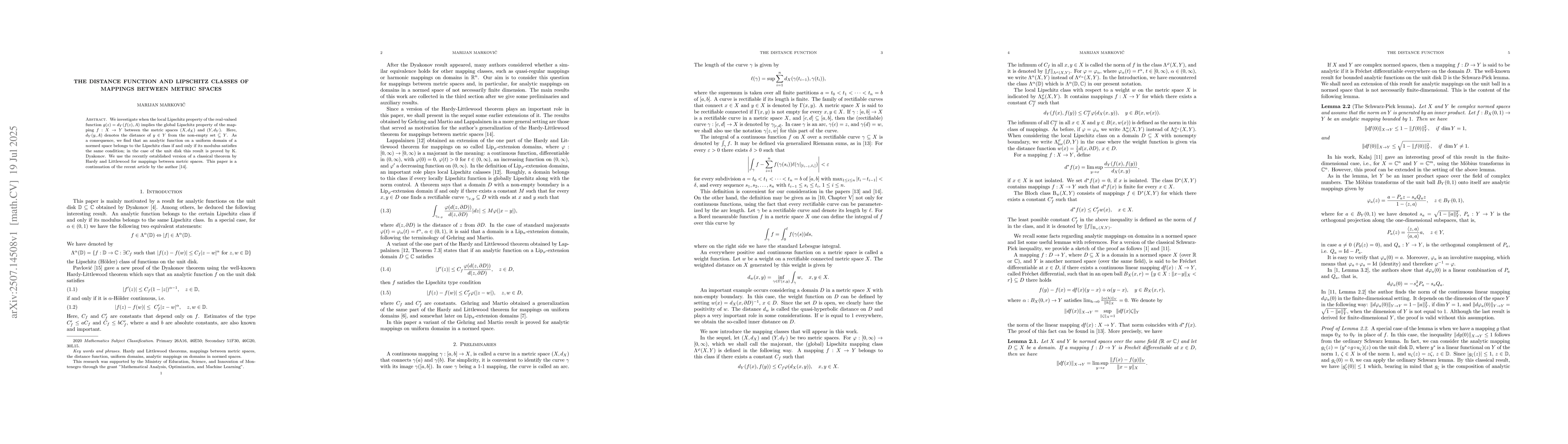 We investigate when the local Lipschitz property of the real-valued function $g(z) = d_Y (f(z),A)$ implies the global Lipschitz property of the mapping $f:X\to Y$ between the metric spaces $(X,d_X)$ and $(Y,d_Y)$. Here, $d_Y(y,A)$ denotes the distance of $y\in Y$ from the non-empty set $\subseteq Y$. As a consequence, we find that an analytic function on a uniform domain of a normed space belongs to the Lipschitz class if and only if its modulus satisfies the same condition; in the case of the unit disk this result is proved by K. Dyakonov. We use the recently established version of a classical theorem by Hardy and Littlewood for mappings between metric spaces. This paper is a continuation of the recent article by the author [14].