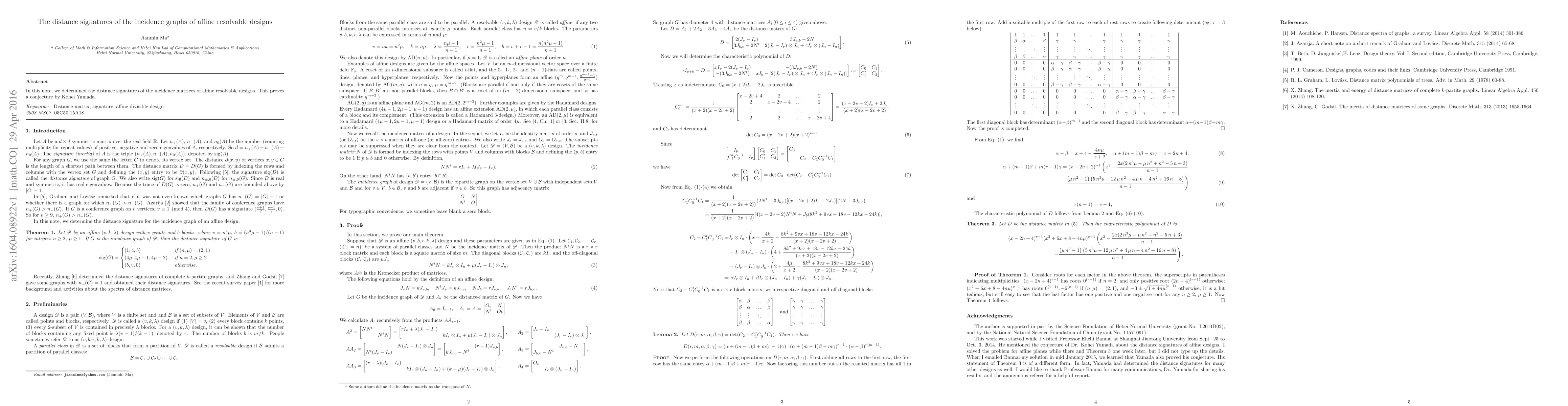 In this note, we determined the distance signatures of the incidence matrices of affine resolvable designs. This proves a conjecture by Kohei Yamada.