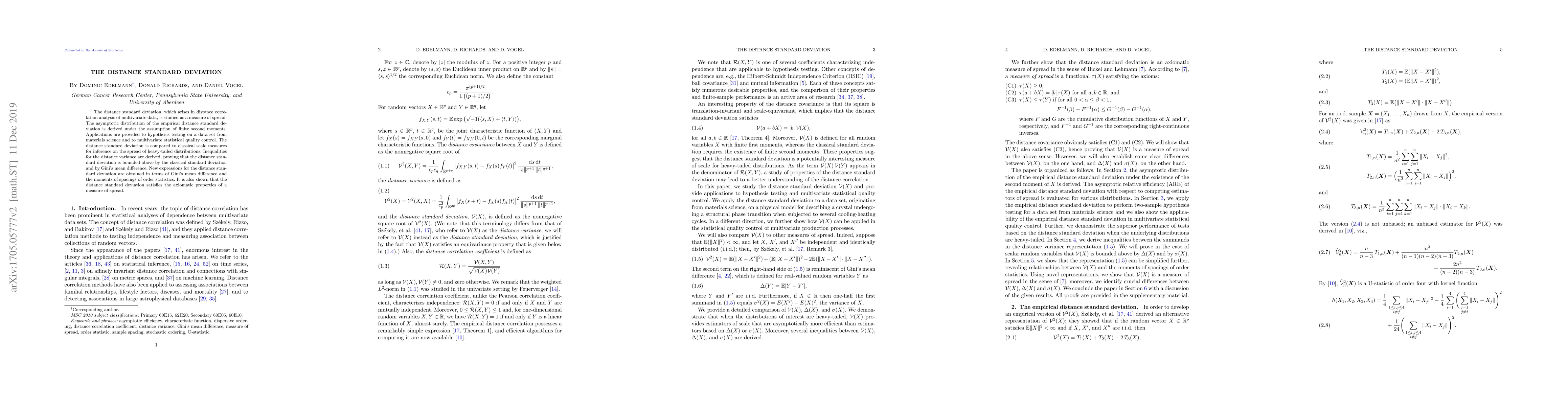 The distance standard deviation is a measure of spread used in multivariate data analysis, offering an alternative to classical scale measures for heavy-tailed distributions, with applications in materials science and statistical quality control.