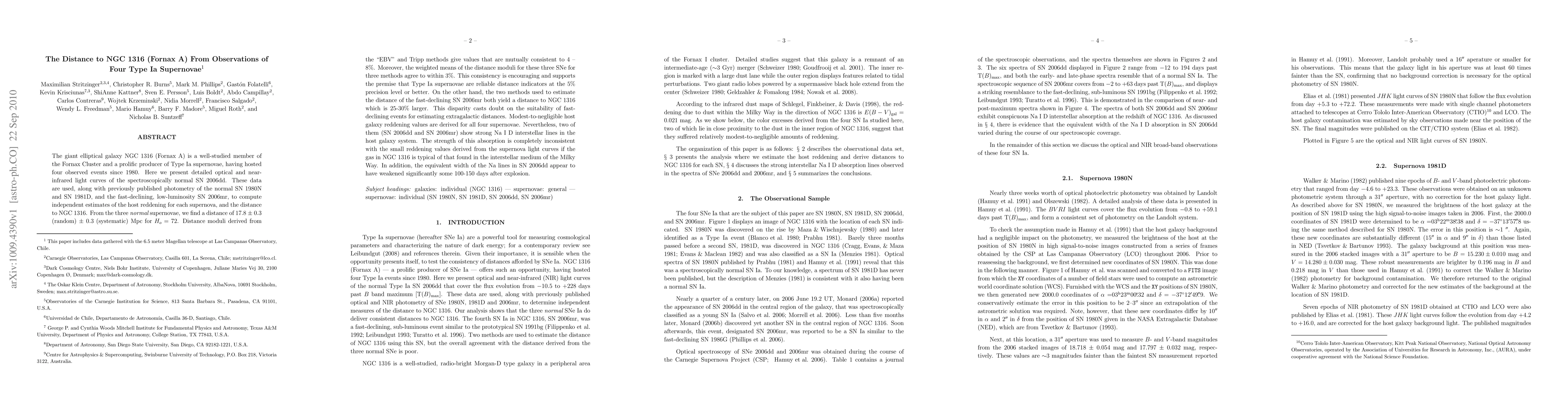 This paper estimates the distance to NGC 1316 (Fornax A) using four Type Ia supernovae, finding a consistent distance of 17.8 Mpc for three normal supernovae, while fast-declining SN 2006mr suggests a 25-30% larger distance, questioning its reliability. The study also notes discrepancies in interstellar absorption lines in two supernovae.