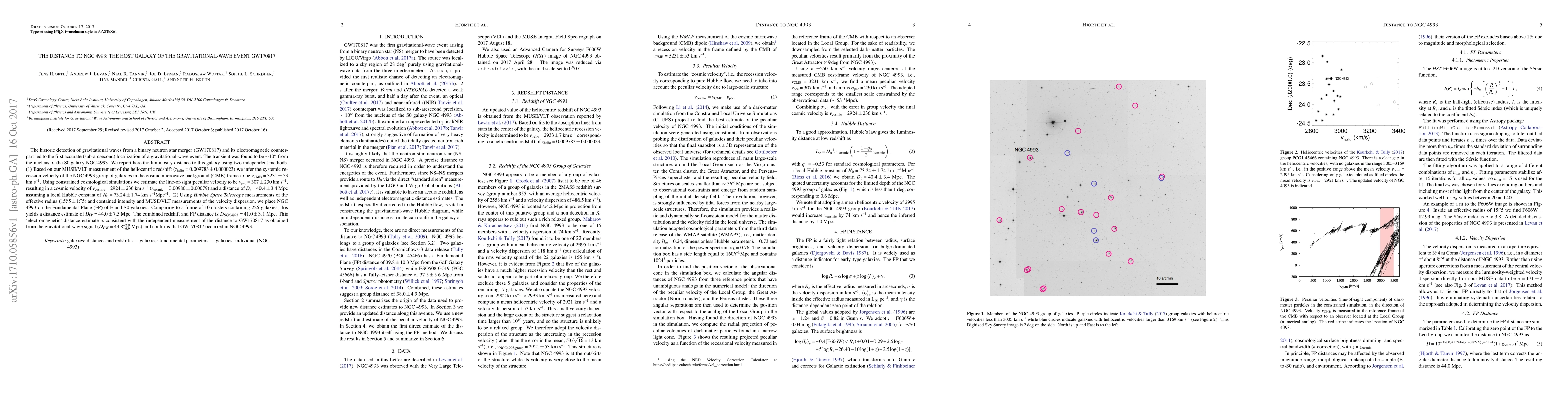 The historic detection of gravitational waves from a binary neutron star merger (GW170817) and its electromagnetic counterpart led to the first accurate (sub-arcsecond) localization of a gravitational-wave event. The transient was found to be $\sim$10" from the nucleus of the S0 galaxy NGC 4993. We report here the luminosity distance to this galaxy using two independent methods. (1) Based on our MUSE/VLT measurement of the heliocentric redshift ($z_{\rm helio}=0.009783\pm0.000023$) we infer the systemic recession velocity of the NGC 4993 group of galaxies in the cosmic microwave background (CMB) frame to be $v_{\rm CMB}=3231 \pm 53$ km s$^{-1}$. Using constrained cosmological simulations we estimate the line-of-sight peculiar velocity to be $v_{\rm pec}=307 \pm 230$ km s$^{-1}$, resulting in a cosmic velocity of $v_{\rm cosmic}=2924 \pm 236$ km s$^{-1}$ ($z_{\rm cosmic}=0.00980\pm 0.00079$) and a distance of $D_z=40.4\pm 3.4$ Mpc assuming a local Hubble constant of $H_0=73.24\pm 1.74$ km s$^{-1}$ Mpc$^{-1}$. (2) Using Hubble Space Telescope measurements of the effective radius (15.5" $\pm$ 1.5") and contained intensity and MUSE/VLT measurements of the velocity dispersion, we place NGC 4993 on the Fundamental Plane (FP) of E and S0 galaxies. Comparing to a frame of 10 clusters containing 226 galaxies, this yields a distance estimate of $D_{\rm FP}=44.0\pm 7.5$ Mpc. The combined redshift and FP distance is $D_{\rm NGC 4993}= 41.0\pm 3.1$ Mpc. This 'electromagnetic' distance estimate is consistent with the independent measurement of the distance to GW170817 as obtained from the gravitational-wave signal ($D_{\rm GW}= 43.8^{+2.9}_{-6.9}$ Mpc) and confirms that GW170817 occurred in NGC 4993.