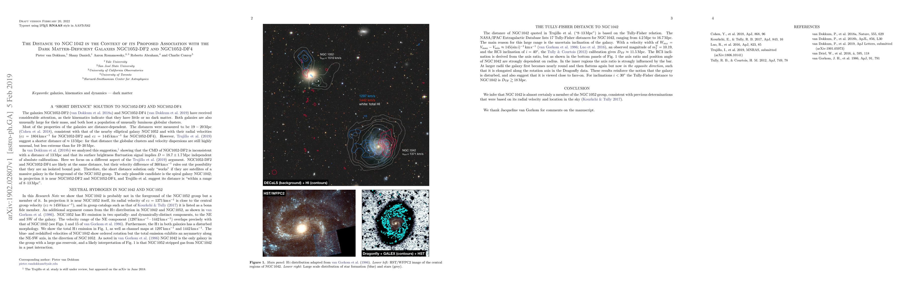 It has been suggested that the dark matter-deficient galaxies NGC1052-DF2 and NGC1052-DF4 might not be members of the NGC1052 group but in the foreground at $\sim 13$ Mpc, and satellites of the bright spiral galaxy NGC1042. We previously showed that the CMDs of the galaxies are inconsistent with this hypothesis, and derived distances of 19-20 Mpc from their surface brightness fluctuation signals. Here we note that NGC1042 is almost certainly a member of the NGC1052 group as well, based on its radial velocity, the HI distribution in the NGC1052/NGC1042 system, and the Tully-Fisher relation.
