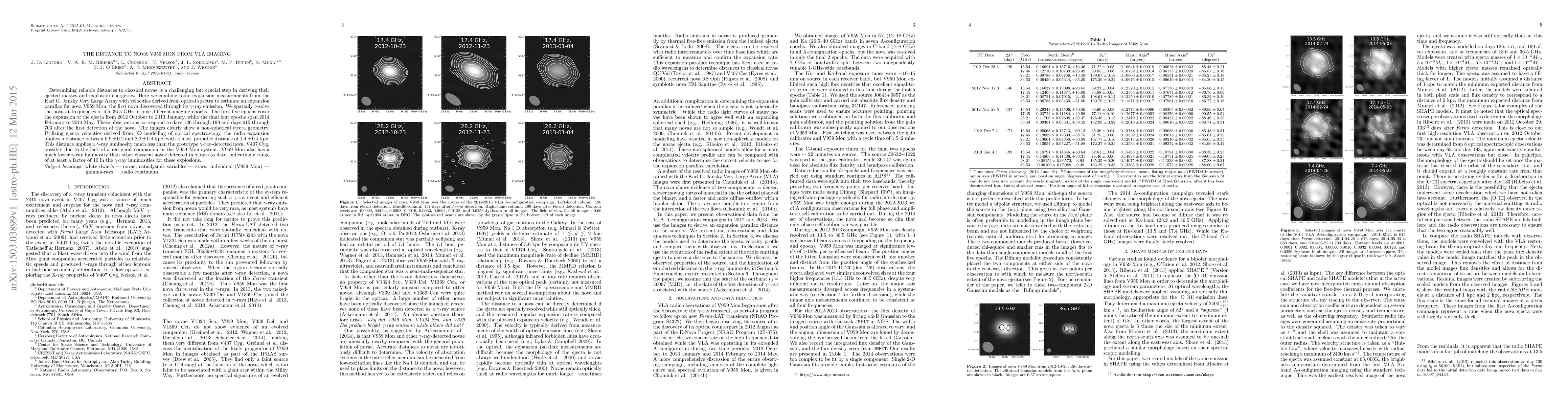 This paper estimates the distance to nova V959 Mon using radio expansion measurements from the VLA and optical velocities, finding a probable distance of 1.4 +/- 0.4 kpc. The study reveals a non-spherical ejecta geometry and suggests V959 Mon's gamma-ray luminosity is much lower than other detected gamma-ray novae.