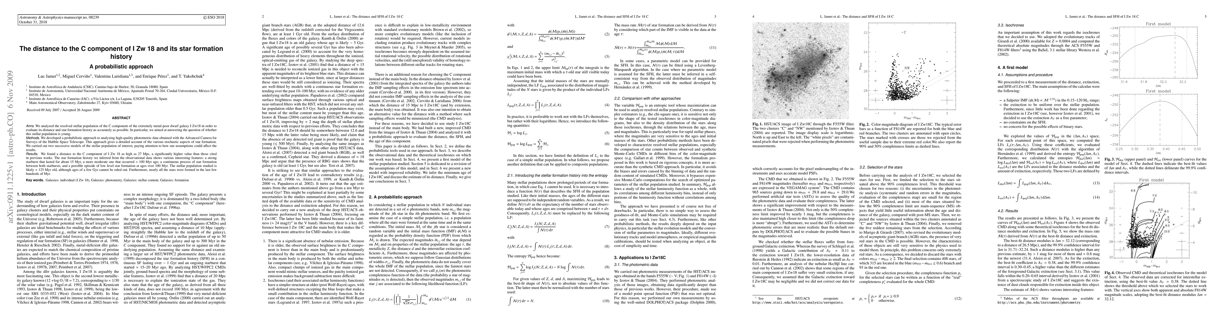 We analyzed the resolved stellar population of the C component of the extremely metal-poor dwarf galaxy Izw18 in order to evaluate its distance and star formation history as accurately as possible. In particular, we aimed at answering the question of whether this stellar population is young. We developed a probabilistic approach to analyzing high-quality photometric data obtained with the Advanced Camera for Surveys of the Hubble Space Telescope. This approach gives a detailed account of the various stochastic aspects of star formation. We carried out two successive models of the stellar population of interest, paying attention to how our assumptions could affect the results. We found a distance to the C component of I Zw 18 as high as 27 Mpc, a significantly higher value than those cited in previous works. The star formation history we inferred from the observational data shows various interesting features: a strong starburst that lasted for about 15 Myr, a more moderate one that occurred approx 100 Myr ago, a continuous process of star formation between both starbursts, and a possible episode of low level star formation at ages over 100 Myr. The stellar population studied is likely approx 125 Myr old, although ages of a few Gyr cannot be ruled out. Furthermore, nearly all the stars were formed in the last few hundreds of Myr.
