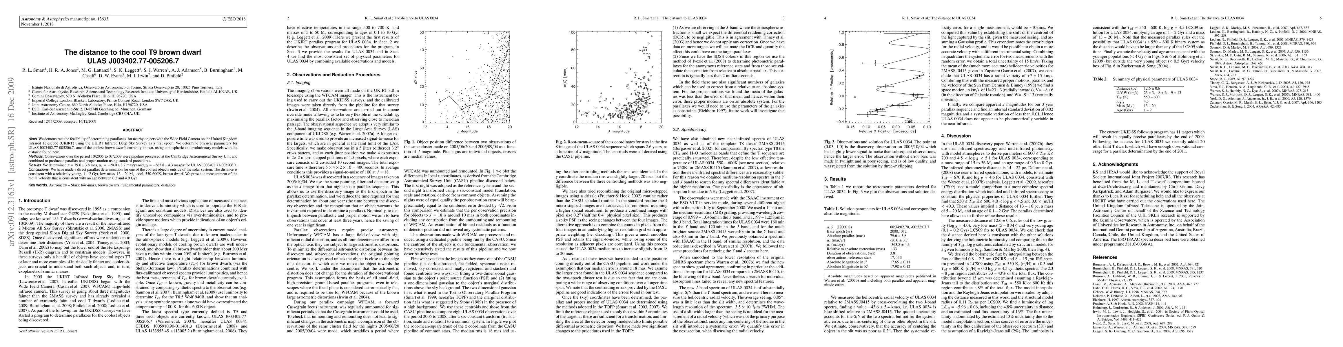 Aims. We demonstrate the feasibility of determining parallaxes for nearby objects with theWide Field Camera on the United Kingdom Infrared Telescope (UKIRT) using the UKIRT Infrared Deep Sky Survey as a first epoch. We determine physical parameters for ULAS J003402.77-005206.7, one of the coolest brown dwarfs currently known, using atmospheric and evolutionary models with the distance found here. Methods. Observations over the period 10/2005 to 07/2009 were pipeline processed at the Cambridge Astronomical Survey Unit and combined to produce a parallax and proper motion using standard procedures. Results. We determined pi = 79.6 +/- 3.8 mas, mura = -20.0 +/- 3.7 mas/yr and mudec = -363.8 +/- 4.3 mas/yr for ULAS J003402.77-005206.7. Conclusions. We have made a direct parallax determination for one of the coolest objects outside of the solar system. The distance is consistent with a relatively young, 1 - 2 Gyr, low mass, 13 - 20 MJ, cool, 550-600K, brown dwarf. We present a measurement of the radial velocity that is consistent with an age between 0.5 and 4.0 Gyr.