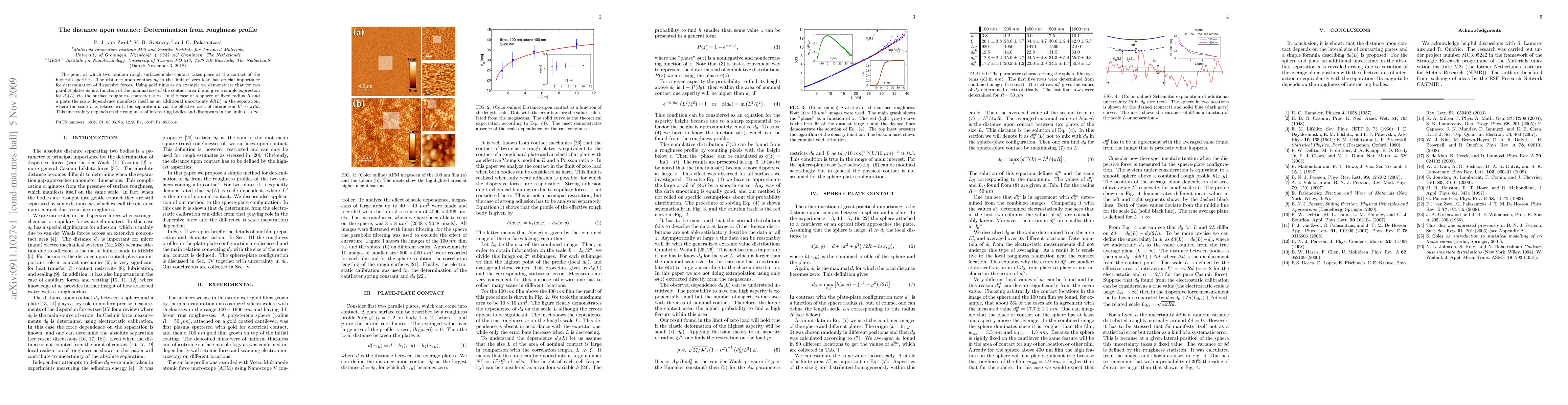 The point at which two random rough surfaces make contact takes place at the contact of the highest asperities. The distance upon contact d_0 in the limit of zero load has crucial importance for determination of dispersive forces. Using gold films as an example we demonstrate that for two parallel plates d_0 is a function of the nominal size of the contact area L and give a simple expression for d_0(L) via the surface roughness characteristics. In the case of a sphere of fixed radius R and a plate the scale dependence manifests itself as an additional uncertainty \delta d(L) in the separation, where the scale L is related with the separation d via the effective area of interaction L^2\sim\pi Rd. This uncertainty depends on the roughness of interacting bodies and disappears in the limit L\to \infty.