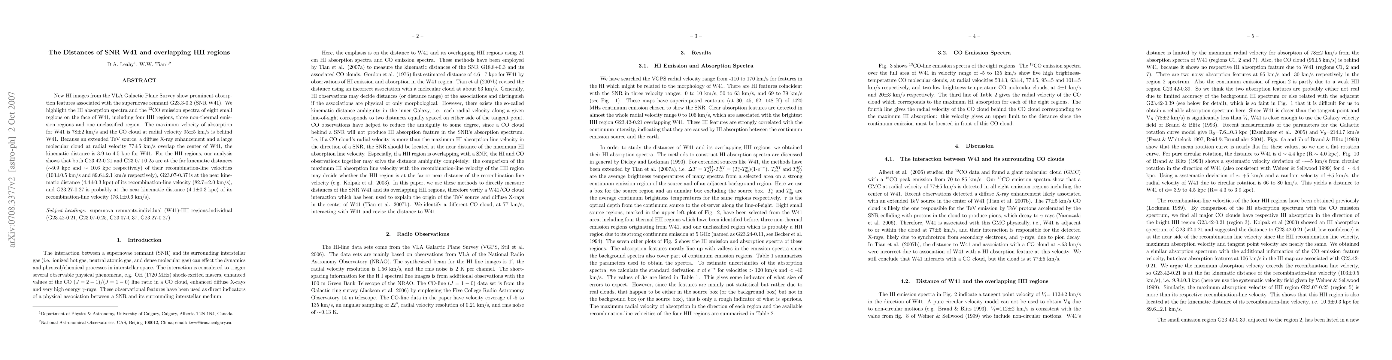 New HI images from the VLA Galactic Plane Survey show prominent absorption features associated with the supernovae remnant G23.3-0.3 (SNR W41). We highlight the HI absorption spectra and the $^{13}$CO emission spectra of eight small regions on the face of W41, including four HII regions, three non-thermal emission regions and one unclassified region. The maximum velocity of absorption for W41 is 78$\pm$2 km/s and the CO cloud at radial velocity 95$\pm$5 km/s is behind W41. Because an extended TeV source, a diffuse X-ray enhancement and a large molecular cloud at radial velocity 77$\pm$5 km/s are also projected at the center of W41, these yield the kinematic distance of 3.9 to 4.5 kpc for W41. For HII regions, our analyses reveal that both G23.42-0.21 and G23.07+0.25 are at the far kinematic distances ($\sim$9.9 kpc and $\sim$ 10.6 kpc respectively) of their recombination-line velocities (103$\pm$0.5 km/s and 89.6$\pm$2.1 km/s respectively), G23.07-0.37 is at the near kinematic distance (4.4$\pm$0.3 kpc) of its recombination-line velocity (82.7$\pm$2.0 km/s), and G23.27-0.27 is probably at the near kinematic distance (4.1$\pm$0.3 kpc) of its recombination-line velocity (76.1$\pm$0.6 km/s).