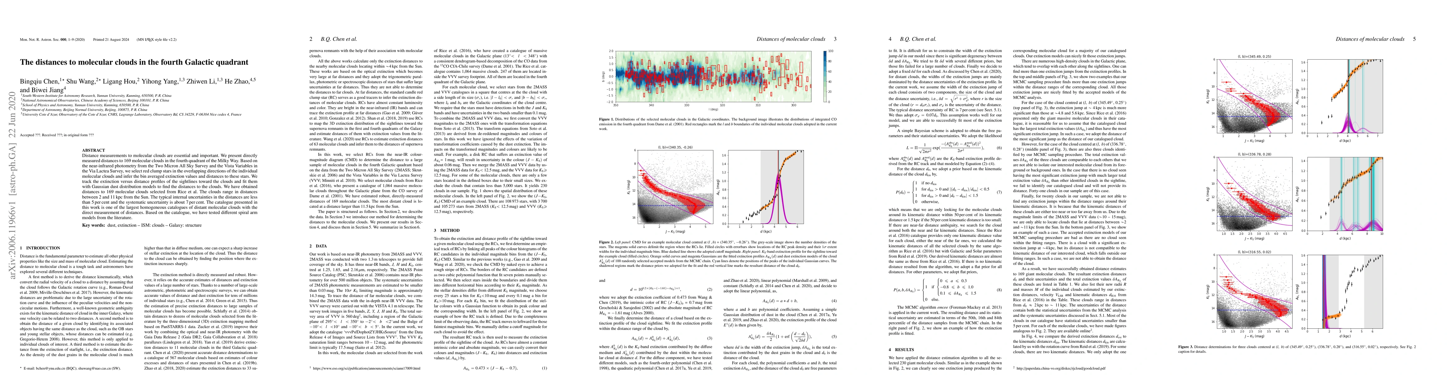This paper presents direct distance measurements to 169 molecular clouds in the fourth Galactic quadrant using near-infrared photometry, resulting in a large, homogeneous catalogue with typical uncertainties below 5%. The study tests various spiral arm models against this new data.