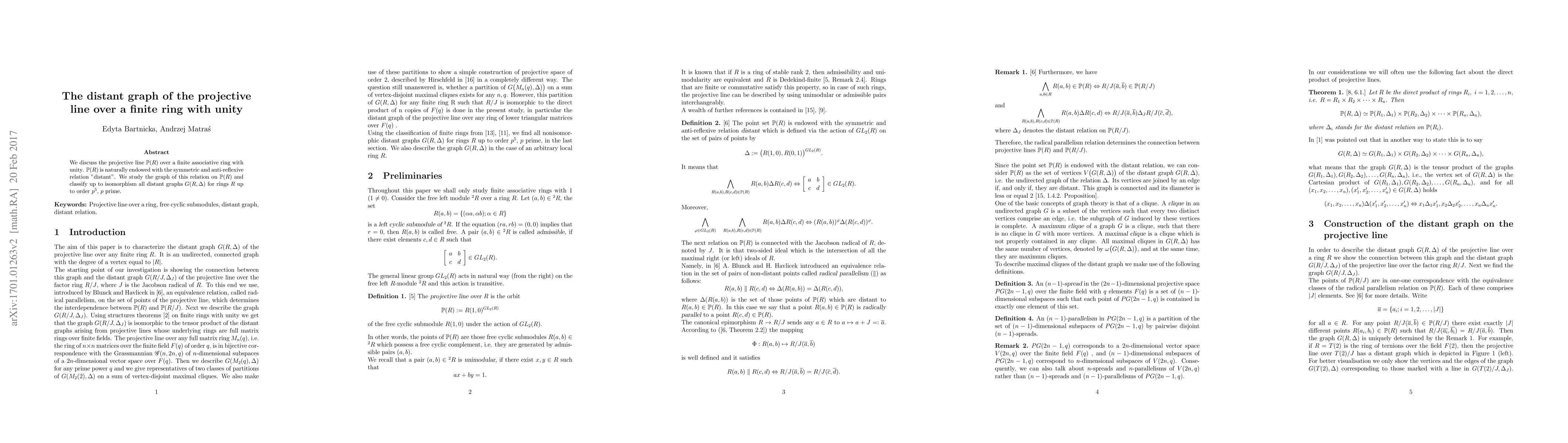 We discuss the projective line $\mathbb{P}(R)$ over a finite associative ring with unity. $\mathbb{P}(R)$ is naturally endowed with the symmetric and anti-reflexive relation "distant". We study the graph of this relation on $\mathbb{P}(R)$ and classify up to isomorphism all distant graphs $G(R, \Delta)$ for rings $R$ up to order $p^5$, $p$ prime.