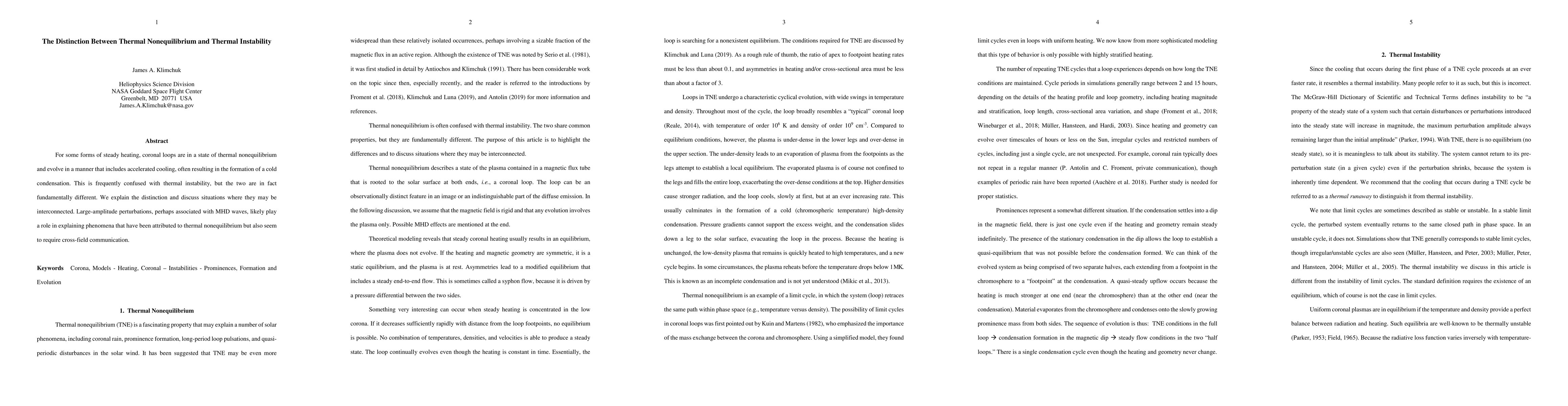 This paper distinguishes thermal nonequilibrium, characterized by accelerated cooling and cold condensation in coronal loops under steady heating, from thermal instability, clarifying their fundamental differences. It suggests that large-amplitude perturbations, possibly linked to MHD waves, may explain phenomena previously attributed to nonequilibrium but requiring cross-field communication.